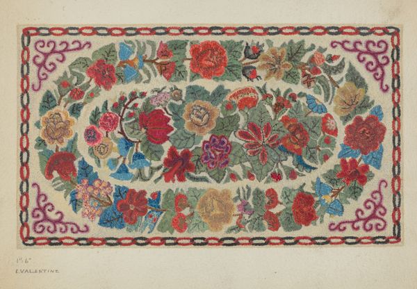 Editor: This is Marian Curtis Foster’s "Hooked Rug," created around 1936. It looks to be a design sketch rendered in watercolor and drawing, perhaps on paper, for an actual textile rug. I find the oval format and floral motifs very charming. What strikes you most about it? Curator: It’s fascinating how this piece utilizes floral motifs, connecting to centuries of symbolic language embedded in flowers. The arrangement—central bouquet, framed by trailing vines and corner foliage—suggests a visual echo of classical tapestries. What feelings does this formal structure evoke? Editor: A sense of contained beauty, I suppose, almost like a secret garden. The colours are quite muted, adding to the feeling of something cherished and preserved. Curator: Precisely. Consider the tradition of hooked rugs, often associated with resourcefulness and domestic craft. Foster, in rendering this in watercolor, elevates a humble folk art to a more 'refined' art form. What does that elevation tell us, culturally speaking? Is she preserving a tradition, or perhaps transforming its meaning? Editor: I see what you mean! It’s like she’s honoring the craft while also placing it in a fine art context. So, the rug becomes less about utility and more about memory, perhaps a connection to the past? Curator: Indeed. It evokes memory – not just of personal comfort, but a cultural memory tied to home, hearth, and heritage. And remember, symbols are never static. Their meanings shift and deepen with time and perspective. Do you think a contemporary viewer might find new resonance in this piece? Editor: I think so. In a world of mass-produced goods, the handmade quality becomes even more precious, imbuing the image with an even greater sense of nostalgia and connection to a simpler past. Curator: A beautifully stated sentiment. This rug, rendered in watercolor, is not simply a design, but a potent symbol of cultural continuity and the enduring power of visual language.