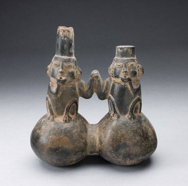 Editor: This ceramic sculpture, a "Double-Chambered Vessel with Serrated Stirrup Spout in Form of Human Head," likely created between 1200 and 1450 by the Chimú culture, has a kind of solemn, weighty presence. The smooth, dark ceramic is very striking. What stories does this vessel hold, in your opinion? Curator: This piece offers us a powerful lens through which to examine power dynamics within the Chimú society. The human head, rendered in such a formal style, wasn't just decorative. Think about who was represented, and who was doing the representing. What social structures and belief systems might it reinforce? Editor: It makes me wonder if it represents someone specific, maybe a ruler or deity? The spout has these small serrated edges like teeth and it almost seems threatening, or at least, authoritative. Curator: Precisely! The 'threatening' aspect you identified—could that reflect the realities of Chimú imperialism and warfare? Who benefitted from that system and how is that reflected here? How does its function as a vessel—something that holds and gives—complicate the reading? Editor: So, it’s not just about aesthetics. It reflects the politics and the complex social hierarchies of the time? Almost like propaganda, in a way? Curator: Absolutely! And how do we, as contemporary viewers, engage with these histories embedded within the artwork? Does simply appreciating its form absolve us from considering its ethical implications? Editor: I never considered it that way before! I will never look at ancient art in the same way. Curator: These objects are not just beautiful artifacts from the past; they're active participants in ongoing dialogues about power, representation, and justice. Engaging with these complexities is what makes art history truly meaningful.