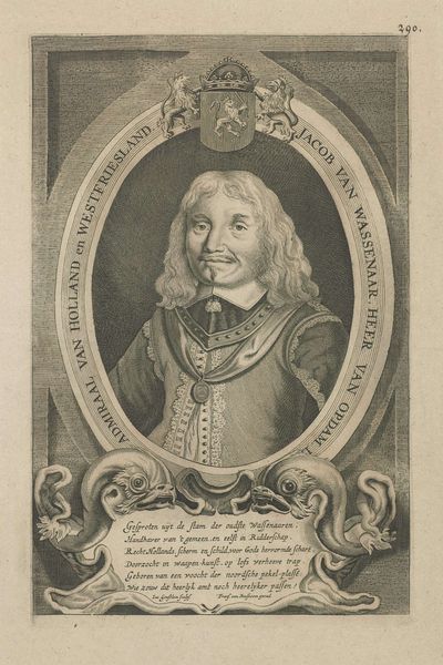 Cornelis Visscher made this portrait of Dirk VII, Count of Holland, using pen and gray ink, around the mid-17th century, a period marked by significant political and social stratification. Visscher, working during the Dutch Golden Age, captures more than just a likeness; he presents an assertion of power and lineage. Dirk VII, who lived from the 12th to 13th century, is depicted through the lens of Visscher's 17th-century Dutch society, where class distinctions were visually reinforced. Consider how Visscher employs meticulous detail to convey not only Dirk VII's physical attributes but also his status and authority. The elaborate frame, the heraldic symbols, and the Count's dignified bearing all contribute to a narrative of dynastic power. This image invites us to reflect on the enduring nature of portraiture as a tool for constructing and communicating identity across generations. How does this portrayal of Dirk VII speak to contemporary issues of power, representation, and historical memory?