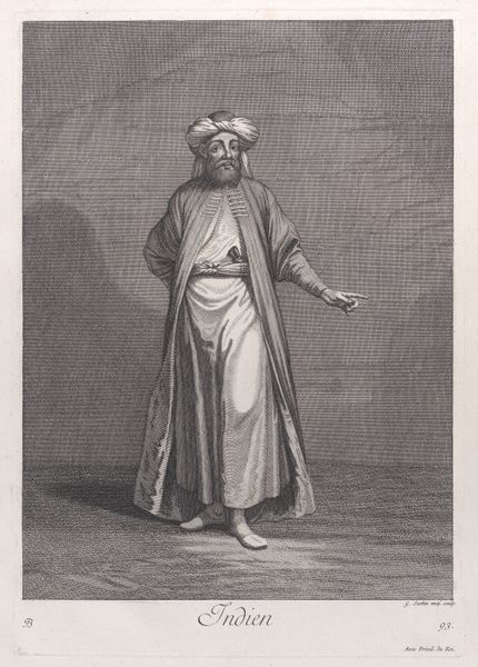 Editor: This etching, "Standing Man in Oriental Dress" by Jan Lievens, dates back to sometime between 1625 and 1674. I find the textures fascinating, especially how the etching creates depth using just lines. What strikes you about its visual elements? Curator: Notice first how Lievens manipulates line weight and density to model the figure and drapery. Observe the contrast between the densely etched areas, suggesting shadow and volume, and the more sparsely rendered background, which creates a sense of depth and atmosphere. What effect does this contrast have on your reading of the figure? Editor: It makes the figure stand out in contrast to the busy background, almost looming with significance! It seems, however, that the figure itself lacks a specific focal point - almost blending with his robes. Curator: Precisely. While the subject matter implies a portrait, consider the overall composition. The figure is placed asymmetrically, occupying only a portion of the pictorial space. How does this positioning contribute to the work's overall meaning, when understanding Baroque style? Editor: I think it suggests a certain openness and dynamism, rather than the traditional formality we might expect. It keeps the viewer’s eyes moving. Curator: Yes. The Baroque favors movement, emotion and intricate detail. Note the man's attire; while exoticizing, it is depicted with detailed textures and layering. Also consider the almost sketch-like background to foreground balance. These artistic components coalesce, yielding the distinctive qualities and meaning associated with Baroque era portraiture. Editor: I hadn’t thought about how the techniques themselves contributed to the meaning. Thanks for that different view. Curator: My pleasure. Art interpretation thrives through considering interplay between form, technique and context.