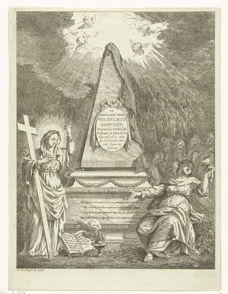 This etching, "Lucianus van Samosata en de Satire," was created by Pieter Tanjé in the 18th century. The composition is a whirlwind of figures and symbols, rendered in meticulous detail. The eye is drawn to the central figure of Lucian, poised as if delivering a dramatic oration. The scene is layered with symbolic meaning. The statue of a figure holding a cross suggests martyrdom, set against a chaotic backdrop of classical architecture and cherubic figures. Tanjé uses stark contrasts of light and shadow to define each element. The image is rife with philosophical commentary. Lucian's writing stand may signify the power of rhetoric. The serpent, masks, and the semi-nude figures imply complex themes of deception and hedonism. Tanjé masterfully uses the etching medium to explore satire as a multi-faceted critique of society and power, inviting viewers to question and interpret the complex symbolism. The artwork doesn't offer singular, but opens a landscape of interpretation.