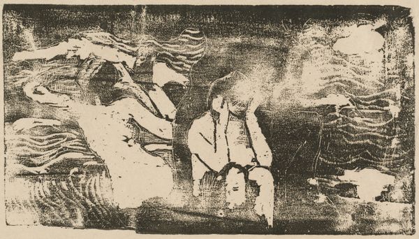 Editor: This is Paul Gauguin’s "At the Black Rocks" from his Suite of Late Wood-Block Prints, made around 1898-99. It’s a woodcut on paper, and the stark contrast really draws me in. What can you tell me about it? Curator: It’s compelling, isn’t it? Consider the labor involved in producing a woodcut at the turn of the century. The physical act of carving the block, the repetitive printing process—these speak volumes about the value Gauguin placed on craft. What do you make of his choice of this medium? Editor: I see it as…intentional. It wasn't the quickest way to reproduce images, surely? Curator: Exactly! And who was he printing these for? The "Suite of Late Wood-Block Prints" was intended for a select audience, and it really contrasts the accessibility of something like mass-produced lithographs. Gauguin elevates this traditionally folk medium, blurring the lines between "high" art and craft. What does the materiality – the texture and rawness – communicate to you? Editor: It almost feels…primitive? Like he’s trying to connect with something elemental, unrefined. Was that common then? Curator: Precisely. Consider also his context. He lived and worked far away from European urban centers. The act of creation and the distribution are a part of how this should be assessed as it reflects Gauguin's position relative to dominant art markets. Does the print change meaning once it goes from point A to point B? How might it be perceived and understood by different social actors? Editor: That makes so much sense! I never thought about how the printing process itself could be so meaningful. Thanks, that really opened my eyes. Curator: It’s about understanding the journey of the artwork, from its creation to its consumption. Considering process, material and social factors opens avenues into so much rich territory!
