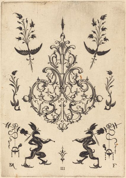 This is Daniel Mignot’s “Title Page: Large Pendant, Two Winged Imaginary Figures at Bottom”, an engraving made in 1596. The late 16th century was a period marked by the rise of mannerism and the Counter-Reformation. Mignot, working in Augsburg, Germany, navigated this complex cultural landscape by creating intricate designs for luxury objects. Note the Latin inscription, "In timore Dei," or "In fear of God". It suggests the religious environment in which Mignot operated, where even decorative arts were imbued with moral considerations. How might the "fear of God" have shaped Mignot's artistic choices? The symmetrical composition and the inclusion of winged figures perhaps reflect a desire to create harmony but also to evoke the divine. These figures are ambiguous, part human and part animal, reflecting a time in which the boundaries between the natural and supernatural were constantly negotiated. Ultimately, Mignot’s pendant design, with its blend of religious and fantastical elements, invites us to consider the complex interplay of faith, identity, and artistic expression in the late 16th century.