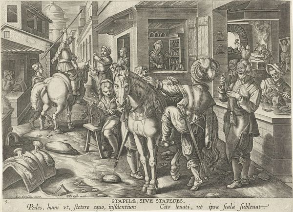 Editor: Here we have "The Prodigal Son Leaving His Father's House," an engraving from 1658. I find the architectural backdrop and the sheer number of figures a little overwhelming at first glance. How do you begin to unpack something like this? Curator: By examining its internal structures, of course. Note the rigorous division of space. The architecture, with its strong horizontals and verticals, creates distinct zones. Consider the placement of figures within those zones. Do you observe any patterns? Editor: Well, there seems to be a central gathering, then figures moving left to right... suggesting departure? And onlookers distributed across windows and doorways. Curator: Precisely. Focus now on the linear quality. The artist uses line not just to define form but to direct our gaze. Follow the lines created by the architecture and the figures' postures. Where do they lead you? Editor: Back to that central group, I guess. Even the dogs seem to pull you to it. Curator: And what of the treatment of light? Observe the areas of greatest contrast, and how those areas influence our reading of the composition. Editor: It is darker around the departure and lighter centrally and around those more stationary figures on the building itself. The building in total dominates a lot of space, establishing stability around the active narrative, visually anchoring everything. The line work gives a sense of movement even though it’s static. Curator: Excellent observation. Line, space, and light—all elements working in concert to structure meaning. One finds harmony even within narrative complexity. Editor: I never really looked at prints that way before. Curator: A structured approach always reveals layers we may not notice on initial viewing. There are universes of visual delight waiting to be excavated from any given picture plane, using tools that apply universally.
