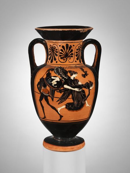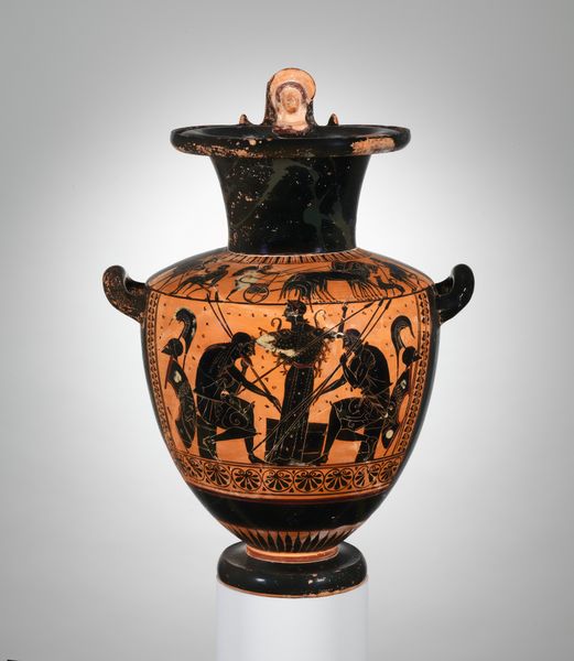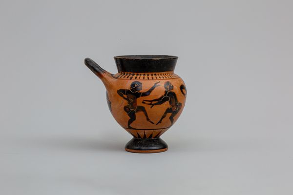 This terracotta lekythos, or oil flask, was made in Ancient Greece using a potter's wheel and paints derived from natural pigments. The form was thrown, allowed to dry, and then painted in a graphic style known as black-figure, a type of decoration widely used in ancient Greece. The striking contrast between the dark figures and light background gives the vase its visual punch, showing a scene of conflict. The details were incised into the painted surface, a subtractive technique that gives the figures sharp definition. The making of terracotta pottery was a laborious, artisanal process, requiring skill in shaping clay and mixing pigments. These vessels were ubiquitous in ancient Greek society, used for storing and pouring oil. The decoration speaks to a culture in which the skilled labor of pottery production met the cultural values of art, storytelling, and trade. This piece is a reminder that even utilitarian objects can be rich with meaning.