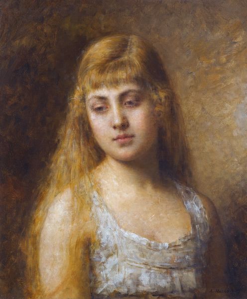 Editor: This is Alexei Harlamoff's "Girl with a Red Shawl," an oil painting that radiates a delicate, almost melancholic, beauty. What strikes me is her gaze; it feels so direct and yet distant. What do you see in this piece? Curator: I see a confluence of symbols, particularly around youth and burgeoning self-awareness. Notice how the red shawl both warms and seems to subtly restrain her, a visual representation, perhaps, of passion tempered by societal expectations. Does the red clash or complement? Editor: That's interesting. It feels more complementary, adding warmth rather than constraint. Curator: Consider the broader historical context. Academic art often idealizes its subjects, imbuing them with universally recognized traits. The red, a historically potent color, can signify rebellion, beauty, or even danger, layered onto the subject, the shawl. The red shawl transforms, what do you suppose this choice offers its viewers? Editor: Perhaps it represents an inner strength or fire beneath a calm exterior. Or the traditional beauty in her culture? Curator: Exactly! The artist uses that duality, that tension between what is presented and what might be concealed, to invite us into a dialogue about cultural memory and inherited identity. And what do you think about that, having noticed this artwork at first glance? Editor: I initially just saw the beauty, but now I appreciate how the symbols give the painting so much more depth. Curator: Indeed. The symbols create a resonance.