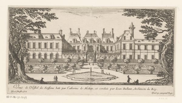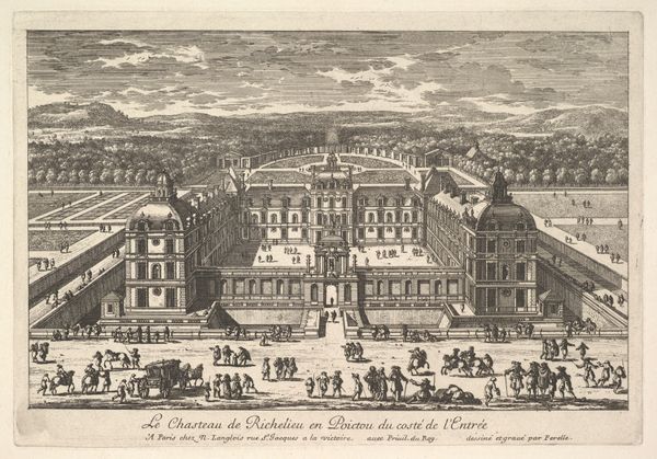 Editor: Here we have "Veüe du Château de Richelieu du Côté du Parc" – that’s "View of the Chateau de Richelieu from the Park Side," a pen and ink etching by Adam Perelle, dating sometime between 1640 and 1695. It strikes me as a carefully constructed world. I'm curious, what stands out to you in this piece? Curator: Oh, the Château de Richelieu! You know, when I look at this, I don't just see a building; I see the ghost of ambition shimmering in the air. Perelle has captured the grandeur, sure, but also a very human theater playing out in the foreground. All those little figures strolling, playing… what do *they* whisper to you? Editor: Well, they seem almost separate from the Chateau itself, like they're acting out their lives in its shadow, but not necessarily a part of it. It makes the Chateau feel more… imposing, maybe? Curator: Exactly! The figures give scale, but they also highlight the separation between the ruling class and everyone else, something very true for the time period, dont you think? Notice how Perelle uses linear perspective to emphasize the chateau's dominance, a subtle power play on paper, you could almost say! Editor: I hadn't considered it like that, more like documentation! Curator: Ah, but isn't art always a document of its time, consciously or unconsciously? This baroque beauty hides a story within those meticulously etched lines. And who knows what games were played on those grounds. Editor: Fascinating! I’ll never see landscapes the same way. Curator: I think that's beautiful, our impressions are truly altered, and so, the artwork takes a life on of its own with each interpretation.
