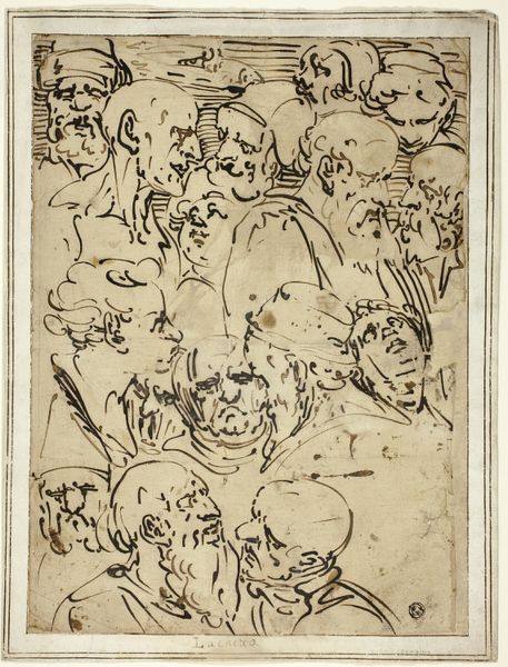 Editor: Here we have Rodolphe Bresdin’s "Studieblad met motieven aan de Italiaanse schilderkunst ontleend," dating somewhere between 1832 and 1885. It's an ink drawing, quite chaotic, almost like a study sheet crammed with figures. What strikes you most about this work? Curator: The chaos, as you say, is telling. Bresdin’s piece speaks to the 19th-century fascination with both medievalism and Italian art, but not in a straightforward, reverential way. Notice how the figures, lifted from Renaissance painting no doubt, are jumbled together without a clear narrative. It feels less like homage and more like a deconstruction. What might this tell us about the cultural status of these historical styles at that time? Editor: That's interesting! So it's not just about admiring the past, but almost questioning its relevance? Like putting it all in a blender? Curator: Precisely! Museums and academies of the 19th century solidified a specific, often idealized, view of art history. Bresdin, by presenting these "motives" divorced from their original contexts, implicitly critiques that institutional narrative. Is he democratizing art, perhaps? Bringing down these idealized figures? Editor: It makes me wonder who this was for. Was Bresdin challenging the established art world, or just experimenting? Curator: Probably a bit of both. Artists then, as now, were navigating a complex social and economic landscape. Creating works that challenged the norm while still participating in the system. What does this tension say about the role of the artist in shaping cultural values? Editor: I never considered how much these historical pieces reveal about the time they were made, not just the period they depict! Curator: Indeed. Art serves as a window into the past and the present, reflecting and shaping the society that produces it. Editor: Thanks. I’ll definitely look at these older pieces with a new perspective.