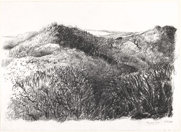 Dirck Nab created this drawing, titled "Duinen bij Egmond," using graphite, emphasizing linear forms and textural contrasts. At first glance, the stark monochrome and energetic lines evoke a raw, windswept environment. The composition reveals a structured yet chaotic scene. Dense clusters of lines suggest hardy shrubbery, while more delicate strokes delineate the undulating dunes. Notice the expressive tree to the right of the drawing. The artist uses line and density to capture its movement. Nab does not rely on traditional perspective. Instead, marks build a sense of depth and atmospheric perspective. This approach challenges fixed representation to prioritize emotional expression and the essence of the landscape. Through its formal qualities, the drawing achieves a balance between chaos and order, reflecting how art continually destabilizes conventional ways of seeing, allowing for new interpretations.