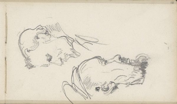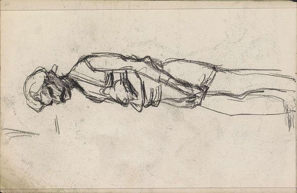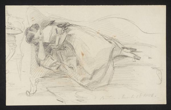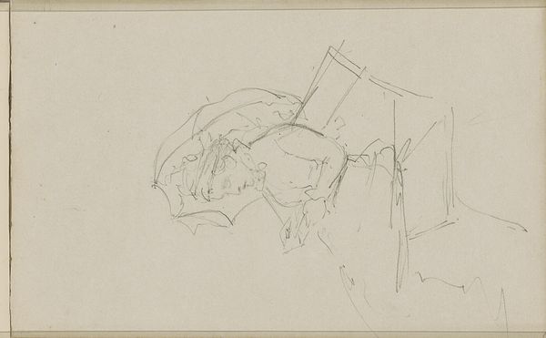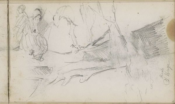 This is Jozef Israëls' sketch, 'Vrouw die een bord afwast', housed here at the Rijksmuseum. The drawing presents a woman at a sink washing dishes, rendered in delicate pencil strokes on paper. Israëls skillfully uses line and shading to suggest form and light. The composition appears almost fragmented, with the woman and her task emerging from a background of loosely sketched lines. This technique disrupts conventional modes of representation by presenting an image that feels both complete and in process. The woman’s form is built up through layers of hatching, creating a sense of depth and volume. The overall effect is one of quiet intimacy, inviting the viewer to consider the everyday realities of labor. The sketch's formal qualities—its emphasis on line, light, and the act of creation—reflect a concern with the fundamental elements of art-making. It underscores the idea that meaning is not fixed but emerges through the dynamic interplay between artist, subject, and viewer.