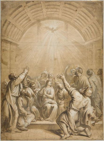 Curator: W.A. Müller’s "Transfigurationen," created between 1748 and 1816 using tempera and gouache on paper, strikes me immediately with its ethereal, dreamlike quality. What is your first impression? Editor: Well, I'm drawn to the social and political implications of religious representation at the time. It presents a very idealized view, clearly designed to reinforce specific power structures. Curator: Interesting point. From a purely material perspective, the combination of tempera and gouache gives the work a unique texture. I wonder how Müller sourced his pigments, and what kind of labor was involved in grinding and mixing them. Editor: Right, and that production is tied into access. Who got to see images like this, and what messages were they absorbing about hierarchy and divine right? We have to acknowledge that depictions of spiritual transcendence often serve earthly agendas. Curator: Precisely. How does the narrative influence production itself? We can ponder if there was an accessibility of specific paper stocks that shaped the final outcome as well as influence painting application techniques such as layering for better visual outcomes? Editor: Absolutely, thinking about Müller’s world, the dominant patriarchal structure heavily influences the figures' representations in this artwork. Moses' powerful presence reflects that while the witnesses cower in a very vulnerable pose, illustrating power imbalances inherent to the social order, right? Curator: It brings to mind the availability and price fluctuation of various types of gouache during that time impacting affordability among artists working for nobility versus common patronage gigs. It begs wondering if cost constraints played factor dictating scale or size limitations Editor: That economic element of artistic production definitely intersects with questions about access, privilege, and cultural narratives. What stories were suppressed and whose perspectives are rendered invisible in these kinds of works. Curator: So, looking at Müller’s work, we see it not only for its aesthetic or narrative qualities, but as a document embedded within specific historical and material conditions. Editor: It allows us to appreciate that these artworks often function to reproduce certain norms. So we can better understand power as both constructed and maintained through art. Curator: Absolutely. By studying its creation and historical setting, we get greater awareness and understanding! Editor: Agreed. Seeing how artwork functions within broader frameworks of social control is important for awareness.