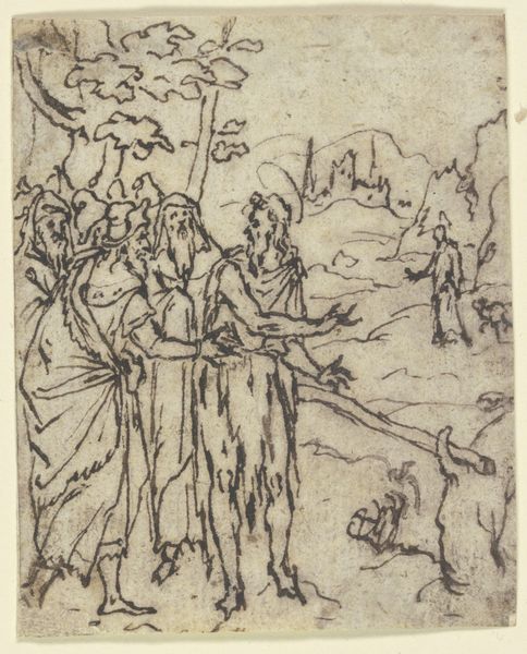 Curator: Rodolphe Bresdin's "Israelites with Grapes from the Promised Land" depicts a scene of abundance, a visual testament to a divinely promised future. What’s your immediate reaction? Editor: It feels…oppressive. The grapes are so oversized, the figures seem burdened, almost enslaved by this promised bounty. Curator: That's a fascinating read, considering the biblical context. The grapes represent the fertility of Canaan, yet Bresdin’s treatment hints at the complex dynamic of promised lands and the labor they demand. Editor: Absolutely. The grape, symbolically rich, evokes sacrifice and celebration. But here, the stark linework and strained postures undermine any sense of triumph, instead pointing towards a critical perspective on the myth itself. Curator: It makes you wonder about Bresdin’s intentions. Perhaps a commentary on the cost of such promises? Editor: Perhaps. It certainly moves beyond a simple illustration, forcing us to confront the ambiguous nature of "deliverance." Curator: Food for thought, indeed. Editor: Definitely a lot to chew on.