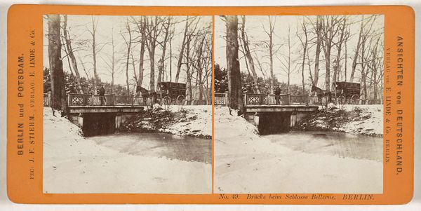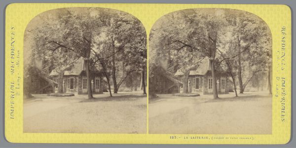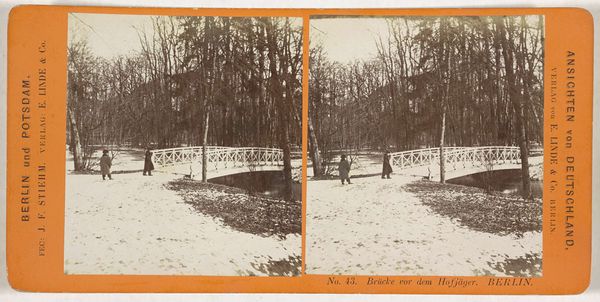 Curator: Here we have a gelatin-silver print, a stereoscopic photograph, created between 1868 and 1870 by Johann Friedrich Stiehm. The image depicts the entrance to the Hofjäger restaurant in Berlin's Tiergarten. Editor: My initial reaction is a certain melancholy. The bare trees, the faded tones... it feels like a study in absence, doesn't it? The image seems to evoke a specific historical context too. Curator: It does. Stiehm captured many architectural and landscape scenes, preserving moments in time through the relatively new medium of photography. The romantic undertones reflect an idealization of nature juxtaposed with urban life. Note the formal symmetry of the restaurant's entryway, almost temple-like in its structure. This "entrance," the threshold, almost represents Berlin as a place. Editor: And what was Berlin becoming? Think of the social tensions and burgeoning nationalism in the newly unified German Empire during that time. The Hofjäger was likely a space for the elite, those benefiting from this power shift, where ideas around nationhood were formulated. So the melancholic feeling isn't just about the faded image; it reflects a disappearing way of life for some, and an exclusionary one for others. It certainly wasn’t available to everyone. Curator: Precisely! The symmetry evokes a sense of order, but it could be an illusion— a desire to mask the underlying societal issues of a rapidly changing metropolis. Even the carefully placed trees seem almost too picturesque. Editor: I wonder who gets to move along that clean path? I imagine seeing class division along a path through the park. Curator: That’s astute, highlighting the often-unacknowledged perspectives within a seemingly simple photograph. Editor: Examining images such as Stiehm’s “Entrance to the Hofjäger Restaurant,” then, pushes us to confront what and, more importantly, who is left out of idealized depictions of city life. It challenges us to excavate the full, complicated stories within what might first appear to be a romantic landscape. Curator: Yes. It encourages us to delve beyond aesthetics, inviting critical engagement with history through visual artifacts, expanding not just who is included, but who controls access in general.