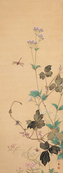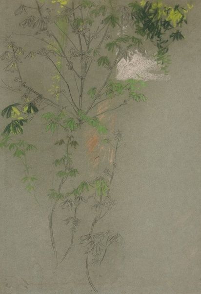 Curator: This print captures a sprig of bamboo, punctuated by a single snail clinging to a leaf. It’s an ink and watercolour woodblock print. Editor: The stillness is striking. The muted grey background seems to amplify the detailed rendering of the bamboo and that solitary snail. There’s a definite contemplative mood to it. Curator: This work is attributed to Ohara Koson, also known as Shoson, a Japanese artist active in the late 19th and early 20th centuries. Koson, like many artists of his era, navigated shifting cultural landscapes, catering to Western tastes while drawing upon traditional Japanese artistic conventions like *ukiyo-e*. He initially worked in what we might term a very classically Japanese style. However, he also adapted to, and for a time primarily created prints and paintings intended for the foreign market. Editor: So, how do you view Koson's relationship to Western reception and the global art market? Given that his works were in high demand during a time when Japan was negotiating its identity on the world stage, might we also examine how "Japaneseness" itself was packaged and consumed? This becomes interesting when we start asking if the rise in appreciation of certain artists during certain times can be associated to Japan's rising imperialism. Curator: That is certainly a relevant interpretation here, and a position worth exploring, though here the artist focuses attention to natural observation and less in national ideology. This aesthetic can be understood as representing, even enacting, a wider concern for the value of observation within certain social circles. Koson had a wonderful capacity to distill observations into emotionally effective works. Editor: I suppose the way in which it captures such a seemingly mundane scene—a snail on a bamboo leaf—and elevates it through artistic rendering might suggest a deeper connection to concepts of naturalism or even animism. Curator: These intimate portrayals served both aesthetic and commercial functions in Koson’s time, acting within international currents that also shaped his work’s distribution and popularity. Editor: The conversation highlights the complex relationship between art, cultural exchange, and societal perceptions. Curator: Precisely, acknowledging that art's significance evolves, shaped by its creators, audiences, and the ever-changing narratives surrounding it.
