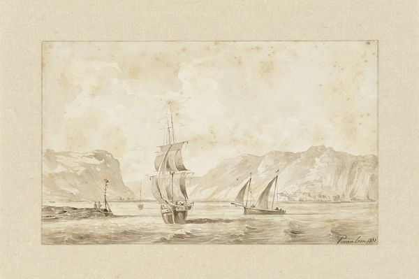 Curator: This subdued pencil drawing immediately conveys a sense of quietude, almost melancholic. There's a hazy atmosphere; the forms of the boats and the distant island are soft, blurred as if viewed through mist. Editor: Indeed. What we are viewing is Frederik Thöming's "View of Capri from the sea," rendered in 1844 with pencil on paper. The very choice of a humble material like pencil underscores a moment in history ripe with cultural shifts and identity questions. Curator: Ah, precisely. The date situates this work in a period of expanding colonialism and Romanticism's fascination with both the sublime and the "authentic." Capri itself becomes a site layered with meaning. Who is Thöming, a Northern European artist, to be representing this Southern Italian landscape? What are the power dynamics at play? Editor: I'm more interested in the tonal range that he achieves here with simple pencil strokes. Notice how he builds depth, especially in rendering the island’s rock face, through subtly shifting densities of shading, echoing atmospheric perspective, drawing the eye naturally across the waters. Curator: The two boats bookending the composition are not simply aesthetic elements; they represent conduits between worlds. Consider the implications of maritime trade, the exploitation of resources, and the narratives of those who travel or are displaced across these very waters. It invites discussions about mobility and economic disparities tied to 19th-century expansionism. Editor: While these considerations provide compelling historical context, to limit our understanding purely to socio-political dimensions risks overlooking the meticulous execution. Focus, instead, on his skillful arrangement of horizontal lines for water and nuanced curvatures which yield an undulating ocean surface; this is all structured line work! Curator: However, if we ignore the sociopolitical implications, we turn a blind eye to the way these serene landscapes served to validate imperial power and the subjugation of people connected to those places. Editor: In the end, what this teaches us is how art pieces work at multiple levels and how valuable varied critical standpoints are in allowing a fuller grasp of them. Curator: A perspective shift that truly broadens the canvas.