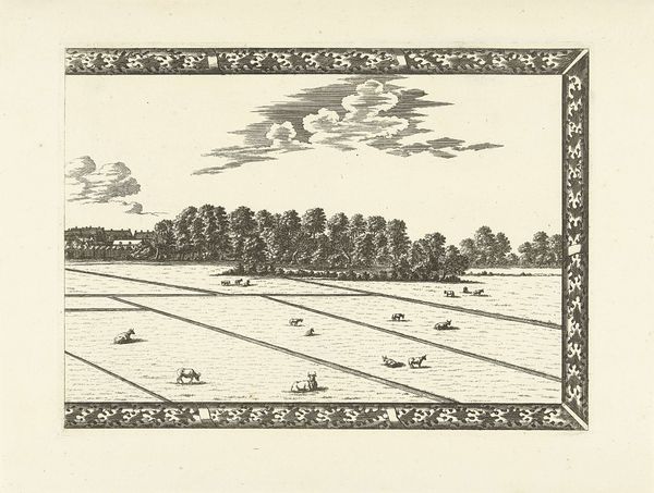 Curator: This is "Panoramisch gezicht op Den Haag," a panoramic view of The Hague, created sometime between 1663 and 1728, and attributed to Cornelis Elandts. It is an etching, with pen and ink details. Editor: My initial impression is tranquility. The scale seems vast, but rendered with an almost painstaking level of detail that is grounding. What strikes you most about the work from a material perspective? Curator: Immediately, it’s the contrast between the delicate medium of etching and the expansive subject matter. The level of fine line work is considerable and must have involved painstaking labour with precise engraving tools and presses. Note the use of line work to indicate the differing landscape features. Editor: Right, consider the implications for those working the land in this panorama. There's a real tension between the depiction of labor as this quaint, almost idyllic scene and the back-breaking reality of agrarian life for the working class at this time. This feels almost propagandistic in its calm depiction. Curator: The use of etching allowed for the mass production and distribution of this image and many others of this period, enabling these idyllic scenes to enter broader circulation. Editor: Exactly, so we're seeing an early form of mass media shaping perceptions and reinforcing societal norms. The image aestheticizes labour, presenting a controlled and peaceful vision. Look how small and neat the workers in the fields seem! How this depiction served as social or political tool is certainly of significance. Curator: Indeed, this etching acted not merely as aesthetic document, but played a material role in the social imagination. Consider the role that The Hague occupied during that era: center for governance. Editor: A real point! A landscape like this is more than scenery; it is bound to power. I wonder what someone toiling away in those fields made of such an image, or whether it would be out of their reach to obtain such image for that matter? Curator: It forces us to rethink simple notions of what a landscape represents; that a simple appreciation misses crucial elements relating to both production and also access to visual culture at that moment. Editor: Precisely. Looking closer, the pen and ink adds to the story, suggesting modification of an already reproducible method of making. And, thinking critically, images like these contribute to shaping our understanding of labor practices during this time period. Curator: Exactly. A piece of craft work as an agent for visual understanding and how such method, now long abandoned by most image production still bears historical value as evidence. Editor: Thank you. It’s important to remind our listeners that so much can be gathered through studying how a visual is constructed, delivered, and consumed!