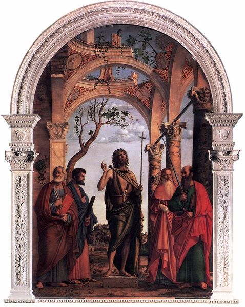 Editor: Cima da Conegliano's "Madonna and Child Enthroned with Saints," painted around 1496, is such a serene and formally arranged piece. The composition feels so balanced, almost mathematical. How do you interpret this work? Curator: Well, first, notice how the painting operates on layers of symbolic communication. It isn’t just a depiction, but a carefully constructed icon. Do you see how the arch evokes both classical architecture and the sacred space it frames? Editor: Yes, definitely. It feels like it's drawing on both classical and Christian traditions. Curator: Exactly. And look at the figures themselves. What do you see in their expressions and gestures? Editor: They seem very composed, almost stoic. Not a lot of overt emotion. Curator: Precisely! Each figure embodies certain virtues and theological concepts. Think about what it meant to represent holiness and divine order during the Italian Renaissance. What symbols do they bear? Editor: I see some figures holding books, maybe representing wisdom or scripture. Are the clothes important too? Curator: The colors, especially Mary's blue robe, traditionally represent purity and royalty. Every detail reinforces a symbolic language that would have been immediately legible to its contemporary audience, from the placement of the figures to the depiction of clouds above. So much cultural weight, captured on canvas. Editor: It’s fascinating how much intention and meaning is embedded in each element. It feels less like a snapshot and more like a carefully worded statement. Curator: Indeed! And that, perhaps, is the power of iconic imagery. It allows cultural memory and continuity to be passed down, encoded in a visual language. Editor: I’ll never look at a Renaissance painting the same way again.