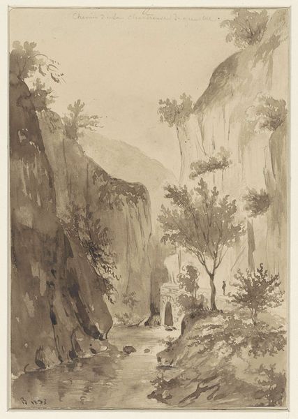 Johann Joachim Faber created this drawing, "Cliffs Overhanging a River Gorge near Sorrento," using brown wash on paper. The composition immediately draws the eye into a contrasting interplay of light and shadow, where massive cliffs frame a distant, sunlit gorge. This structured arrangement evokes a sense of depth and invites you to explore the artwork's spatial dynamics. Faber’s technique utilizes the wash medium to its full potential, achieving tonal variations that articulate the geological forms and lush vegetation. Notice how the verticality of the cliffs is softened by the cascading vines, which creates a rhythm between the solid and the fluid. The artist uses a semiotic system where light represents clarity and openness while shadow alludes to the unknown and inaccessible. In essence, this work is more than just a landscape, it's a study in contrasts, presenting an environment where nature's grandeur is meticulously structured by artistic vision. It’s an invitation to continually re-evaluate how we perceive the world through constructed forms.