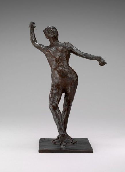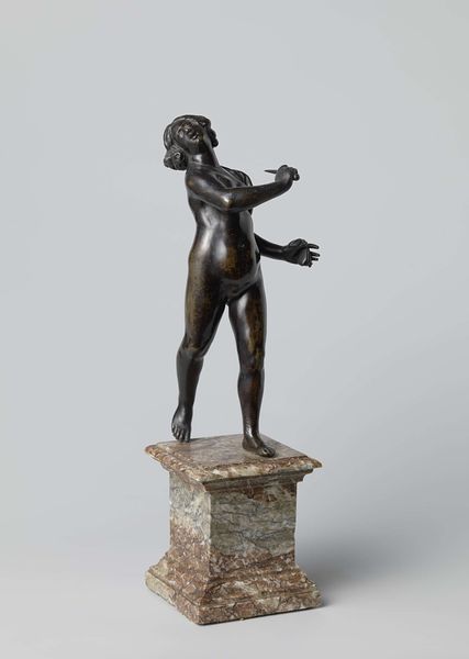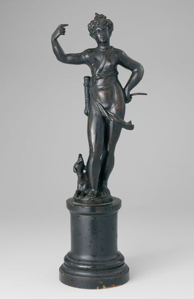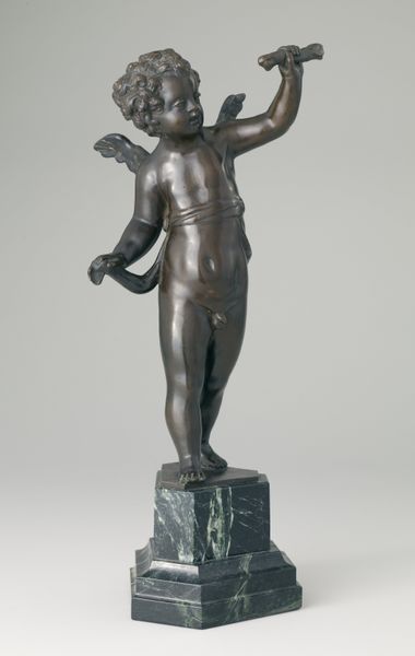 Curator: Before us, we have an arresting small bronze sculpture titled "Cherub," dating back to around 1600, currently residing here at the Minneapolis Institute of Art. Editor: I'm struck by its seeming assertiveness—that arm raised high with what looks like a small trumpet, poised between declaration and delicacy, embodied by the soft curls and slight physique. What's the backstory on cherubs during the Renaissance? Curator: The image of the cherub went through some interesting permutations, particularly as tied to questions of gender and power. From early religious contexts where they figured as powerful guardians of sacred spaces, you start to see them recast in this period, becoming increasingly feminized and decorative. Editor: Precisely, this shift to a more diminutive, almost ornamental role feels pivotal. Look at the object he's holding, it's almost a proclamation of divine intent, or a gentle fanfare—a powerful message delivered via an angel that's visually quite diminutive. Curator: The work's function is also key. Many small bronzes from this era were created for private collectors and displayed within domestic spaces. This domestic context, considered with a more humanist framework increasingly invested in childhood and innocence, invites speculation as to its appeal and intent during that historical period. It begs questions regarding ownership, agency, and performative notions of faith at the time. Editor: Right, and it also speaks volumes about evolving cultural values. Bronze itself, as a material, connotes permanence and worth, so positioning the cherub this way reveals the intention for its inherent image—recasting divine power through this small, intimate object. The image shifts in emotional register, I suspect, within a home than within a vast church setting. Curator: It is an engaging object on so many levels, revealing historical attitudes toward faith, beauty, and power dynamics. Editor: Indeed—it is a testament to how deeply imbued visual symbols can be within a given context. Thank you.