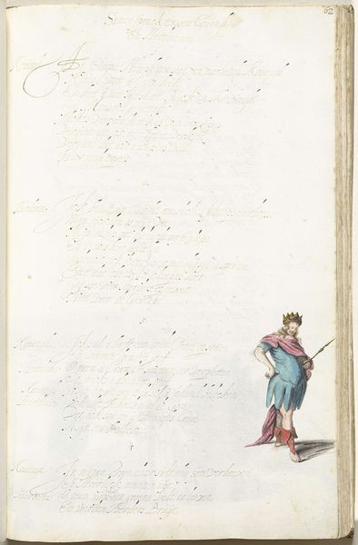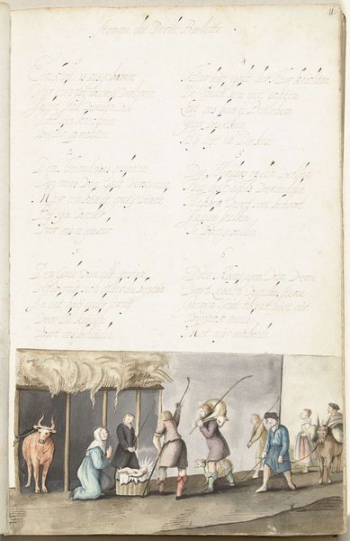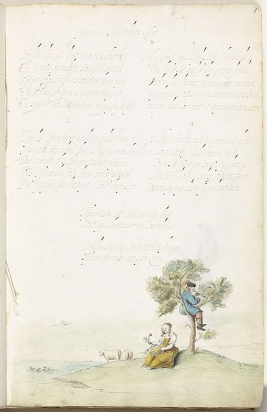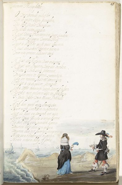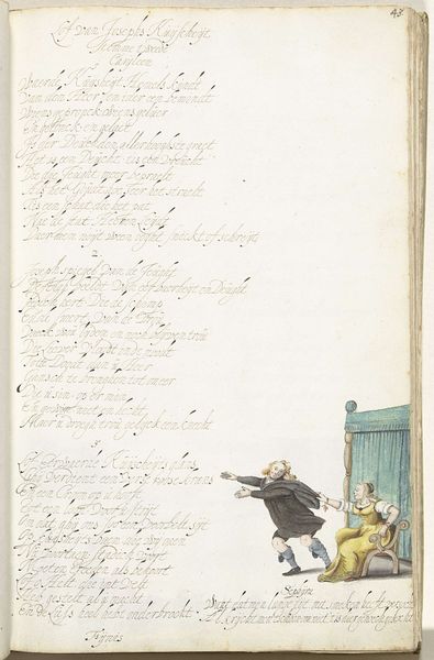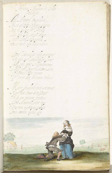 Editor: This is "A Man Tying a Lady's Shoelace" by Gesina ter Borch, created around 1654. It's a watercolor drawing. I’m immediately struck by how intimate and small the scene is within the larger context of what looks like a book page. How do you interpret this work? Curator: It’s interesting you mention intimacy within the book format. Think about how images, especially those depicting private moments, circulated in 17th-century Dutch society. This image complicates our understanding of gender roles, doesn't it? Editor: It does. The man is kneeling before the woman; it flips the power dynamic you usually see in art from this period. Curator: Exactly. Ter Borch, as a female artist, was working within very specific societal constraints. Consider the male gaze, and then consider how a woman might subvert or question that gaze. Is she critiquing male privilege through this image of servitude, or perhaps commenting on courtship rituals? How might her social position have influenced the subject and her mode of representation? Editor: So, you're saying the act of drawing this everyday scene could be a form of social commentary in itself? It’s not just a pretty picture but an observation, almost a protest? Curator: Precisely. It opens up conversations about how gender and class operate in the domestic sphere and the nuanced ways in which artists—particularly women—negotiated their place in that society. Think about the symbolism within the very act of tying a shoelace. Whose needs are being centered here? Editor: I never thought about it that way. Now I'm seeing it as a deliberate disruption of expectations, a subtle act of defiance perhaps. Curator: And that is the power of engaging with art through the lens of its social context; we reveal its complexities and enduring relevance. Editor: I will definitely remember to look for those subtle social dynamics. Thank you for pointing them out!
