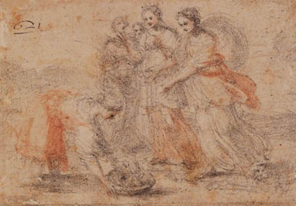 Curator: Luca Giordano's drawing, "Moses Striking the Rock," likely made between 1634 and 1705, depicts a pivotal biblical moment. My first thought is that this captures raw human drama. Editor: My immediate reaction is to the immediacy of the sketch. The pencil lines practically vibrate with movement. Look at the paper, a toned ground, allowing the light pencil work to truly pop, it's such an economic use of material. Curator: It does speak volumes with apparent effortlessness. "Moses Striking the Rock" carries considerable cultural significance. This particular moment underscores the themes of divine intervention and leadership. You know, in art history, it's fascinating how these biblical scenes become tools for reflecting social values. Editor: Absolutely. And note how the materiality adds to this reading. It seems like a page torn from a personal sketchbook. Think of the intimacy— the artist experimenting, rapidly capturing a story that he clearly feels compelled to tell. Was this preparation for a larger work perhaps, something for the art market? Curator: It's very possible, but the loose handling also speaks to the Baroque era's increasing acceptance of preparatory drawings as works of art in themselves. Patrons began to appreciate the artist's hand, their process of invention. This would be a significant change from the previous rigid, formal methods of commissioning artworks, indicating also the slow ascent of the artist as a social class with specific means and status. Editor: And how does this sketch challenge those rigid categories of ‘finished’ versus ‘preparatory?’ It shows an emphasis on the labor, the very act of making, over polished illusionism. And even the unfinished nature—the incomplete areas—are valuable because they make us conscious of Giordano's physical engagement with the drawing itself. It feels real. Curator: "Real" as a constructed value, right? The sketch performs immediacy. Its availability reflects a desire for authentic experience, now deeply ingrained in how art circulates and gains social power. Editor: A point well-taken! Reflecting on it now, seeing how economical but intense each mark is, it does carry more weight than its lightness would allow to expect. Curator: I agree. Examining "Moses Striking the Rock," reminds me of the intertwined narratives of artistic process, biblical symbolism, and shifting cultural appreciation. Editor: From my side, looking closely at the line quality I cannot help but feel grounded into a direct connection to the artist's hand and the material process of artmaking.