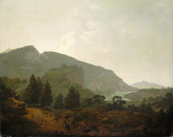 Curator: Albert Bierstadt created this stunning landscape, "Autumn in the Conway Meadows Looking towards Mount Washington, New Hampshire" in 1858. It's an oil on canvas, and embodies the spirit of the Hudson River School. Editor: My first impression is of a serene, almost ethereal space. The colors are muted, but that expansive meadow feels vast and somehow melancholic. There is some heavy foreshadowing through dark masses, so to say. Curator: Exactly, and it captures a particular moment in American expansion. The Hudson River School, and Bierstadt especially, were key in shaping perceptions and promoting a specific ideology. Editor: That ideology being Manifest Destiny, right? Representing the American landscape as an untouched paradise to legitimize westward expansion and Indigenous displacement. Look at the soft, romantic light almost like a blessing. Curator: Precisely. Bierstadt masterfully manipulates light to create this sublime effect, but his landscapes were often composite scenes, more idealized than strictly real. Editor: And that idealization served a political purpose. These paintings romanticized nature, erasing the complexities of the land and its history. The absence of any clear traces of Indigenous presence is deafening. We see deer, mountains, forest— the land for the taking, in other words. Curator: Yes, and the scale is significant, it emphasizes the grandeur and potential bounty of the land and serves as a visual endorsement of territorial acquisition. It's fascinating how art can simultaneously inspire awe and mask problematic agendas. Editor: The art historical legacy of landscapes has always served specific sociopolitical narratives. It serves as a great reminder to critically analyze even the most beautiful scenes, thinking about whose stories are told and whose are erased. It does feel wrong that we only get to discuss that, rather than aesthetics itself. Curator: Absolutely. Art always operates within complex social and historical frameworks. That’s part of what makes looking at the pieces such a complicated experience. Editor: For sure. Even in an awe-inspiring space, it is never exempt from historical critique. It's something we always need to consider, to unveil these layers, and appreciate what is.