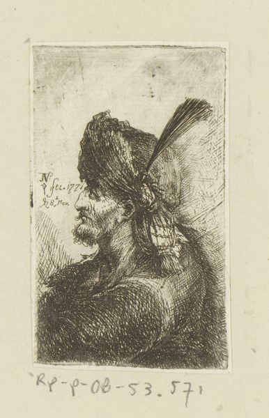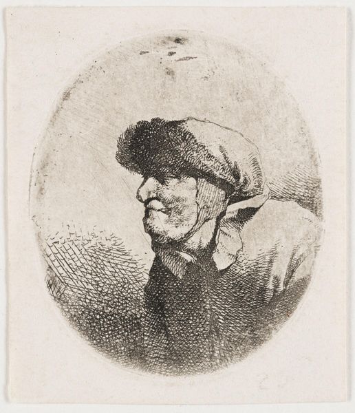Editor: So, this is Adriaen van Ostade's "Buste van een lachende boer" or "Bust of a Laughing Farmer," an etching from around 1650 to 1652. It's currently at the Rijksmuseum. What strikes me is how intimate and almost... vulnerable this portrait feels, despite its subject matter. How do you interpret this work? Curator: The laughter of the farmer, seemingly straightforward, actually becomes a lens through which we can examine societal hierarchies of the Dutch Golden Age. Ostade, while achieving popularity through these genre scenes, simultaneously perpetuates and perhaps subtly critiques the romanticized view of peasant life often consumed by the bourgeoisie. Where does genuine empathy end and class-based spectacle begin, do you think? Editor: That’s a great question! It feels exploitative to flatten someone to a stereotype but is that what Ostade is doing? Curator: Well, consider this: humor directed downwards, towards a perceived lower class, often serves to reinforce existing power structures. Is the laughter *with* him, or *at* him? Analyzing the formal elements—the sketchy lines, the almost caricature-like exaggeration of features—informs this too. Does the rendering dehumanize him, or grant him character? Editor: I see what you mean. I guess it depends on whether the detail emphasizes his humanity or reduces him to an archetype. Maybe it's both at once? Curator: Precisely. These tensions are exactly what make the work so compelling and historically relevant. By probing the artist's choices, we confront broader questions about representation, class, and the gaze. The role of the viewer cannot be ignored when we think about whose laughter gets amplified, and whose is silenced. Editor: I never would have thought about it that way. There’s so much more depth here than initially meets the eye! Curator: That's the power of art: to reflect and refract the complexities of its time, challenging us to confront uncomfortable truths about ourselves and society.