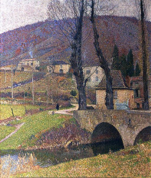 Curator: This is Claude Monet's "The Grande Creuse by the Bridge at Vervy," painted in 1889. Notice how he captures this landscape with such dynamic color and brushstrokes. Editor: Immediately, I feel the chill of a late autumn day. It’s almost melancholic; the colors, while vibrant, hint at the impending winter and perhaps also point at the dramatic upheavals happening socially at the time. Curator: Precisely! The composition is quite fascinating; Monet is, as usual, deeply concerned with the effects of light and how it plays across different surfaces – water, stone, foliage. He's broken down the scene into individual flecks of color. How does it all synthesize? Editor: I see the town almost nestled into the hillside, the water mirroring its structures and perhaps also reflecting a yearning for a harmonious relationship between people and place. But it is a relationship often strained. This painting to me represents a kind of romantic tension of man coexisting with, but also impacting the environment around him. Look at the smokestack, is it industry emerging into idyllic nature? Curator: I think focusing on the social issues distracts a bit too much from the picture, no? But, notice how the bridge functions as a horizontal stabilizer, dividing the painting into distinct zones – the wildness of the river below, and the domesticity above? I mean, Monet is concerned foremost with creating a cohesive pictorial structure through color relationships. Editor: Perhaps, but even these artistic choices are products of the culture in which Monet lived. It wasn’t an accident that Monet painted these scenes – he had privilege to engage with his work and the world around him in this way. What would a person of color see in this painting, when the dominant discourse centered around privileged perspectives, at that moment in time, or even this one? Curator: I appreciate how it evokes not only the sense of a specific place but also a fleeting moment in time, the transient quality of light. The forms may dissolve but their structure stands tall as Monet is considered. Editor: This encounter with Monet's perspective allows us to interrogate broader questions about whose gaze we privilege and whose stories we often overlook. This painting asks that. Curator: I walk away reminded how painting is first and foremost about color and form relationships that give meaning to a subject Editor: It reminds me of our responsibility to broaden our perspectives on beauty, and who has historically been denied access to it.