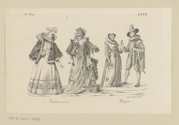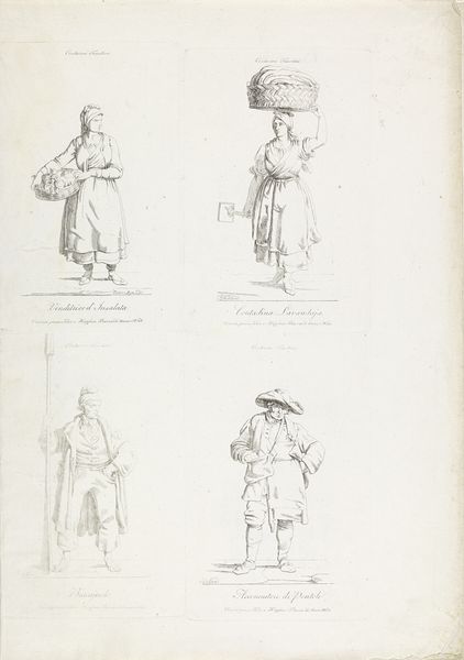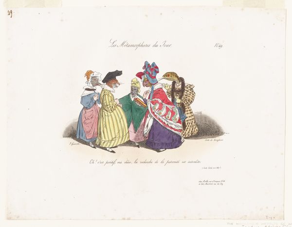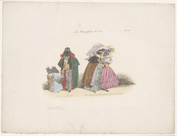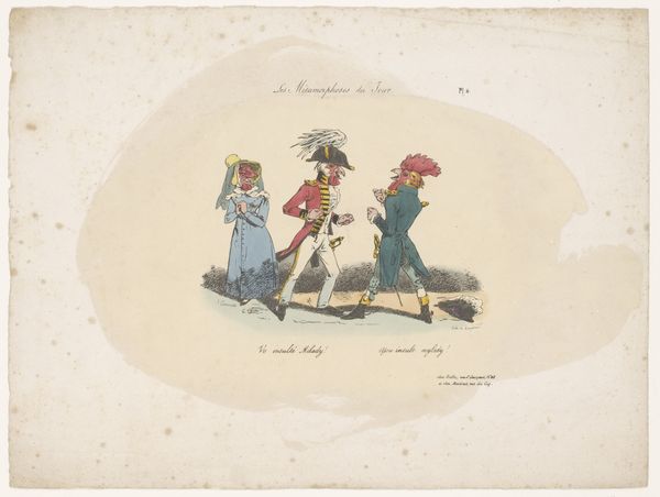 Curator: Before us is "Two Women and a Man with Descriptions of their Appearances," a lithograph and watercolor work by Charles Philipon, dating from around 1829 to 1830. It's currently held here at the Rijksmuseum. Editor: It strikes me as whimsical, almost comical. The pastel hues and simplified forms give it a lighthearted air. But there's also a sharp, observational quality, wouldn’t you say? Curator: Precisely. Philipon masterfully uses line and color to depict these figures, highlighting their specific traits through careful rendering of clothing and posture. Consider the hat on the figure to the left – a structural marvel, a perfect confluence of form and function, visually defining the sitter’s upper verticality. Editor: And note the lithographic process—a relatively new technique then—allowing for broader dissemination of such social commentaries. These aren’t idealized portraits of aristocracy, but studies of identifiable urban types and their occupations—from the middle class up. Look closely, there are hand-written French descriptions underneath each figure, making them readable, as coded signs in Parisian society. Curator: Good point, this work transcends mere illustration, embodying a complex interplay of observation and representation. The rhythmic placement of figures and text activates the two-dimensionality of the work; everything is pushed forward for the viewer’s analysis. Editor: Which is all to say, lithography made art more accessible— less an object of reverence, and more a consumable image in the rapidly transforming Parisian urban experience. A visual commentary produced from industry. Curator: True; by investigating both structural and semiotic qualities within this lithograph, and also acknowledging its societal and technological contexts, one truly comes to appreciate the subtle artistry on display. Editor: It shows how processes like lithography offered not only reproducibility but a unique space for artists to investigate emerging forms of modern subjectivity. Curator: Yes, this study certainly provides much more than just superficial likenesses! Editor: Indeed. The techniques and context together create more than the sum of their parts.