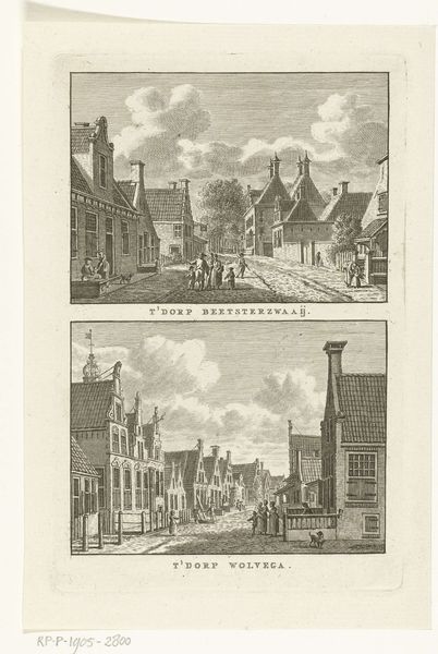 Curator: What captures my eye first about these prints by Carel Frederik Bendorp, entitled 'Twee dorpsgezichten te Hoedekenskerke', dating from between 1786 and 1792, is the way he presents these quiet, parallel narratives of village life. Editor: They’re quaint, almost unnervingly so! There's something so… ordered and contained. It's like a dollhouse view, you know? Two versions of serenity, separated by a line. Curator: Yes, they are a diptych presented one above the other, both detailed views rendered through etching and engraving. Notice how Bendorp utilizes linear precision to create a rich texture and form—it's quite exquisite. Editor: Absolutely, it’s almost mathematical. The use of hatching creates not only shadows and depth but also dictates the mood of each scene, don’t you think? Top print a little busy with action compared to the languid bottom print with its sleepy cows. Curator: Interesting take. It makes me wonder about his intentions here. The prints portray everyday life in Hoedekenskerke. What can these landscapes reveal about the social structures of the time? Are these romantic idylls or documentary observations? Editor: I think it is a bit of both and beyond! Take note of the architecture. There’s a very clear, controlled geometry at play—the houses, the church tower, the roads. All carefully placed to construct very calm little worlds. The way the trees softly frame the lower print seems significant in emphasizing peace. It's beautiful... in a way, it feels constructed, very different from reality. Curator: I agree. Bendorp's manipulation of perspective and the clear lines reflect an aesthetic ideal, shaping how viewers perceive this reality. It’s interesting how even the clouds and smoke contribute to this overall structural balance. Editor: This examination really enhances the appreciation, the prints start resonating even louder when the formalism gives you keys to decode all the historical and artistic decisions at play! Curator: Indeed, each element reveals choices about representation and conveys this historical narrative in profound ways. Thank you.