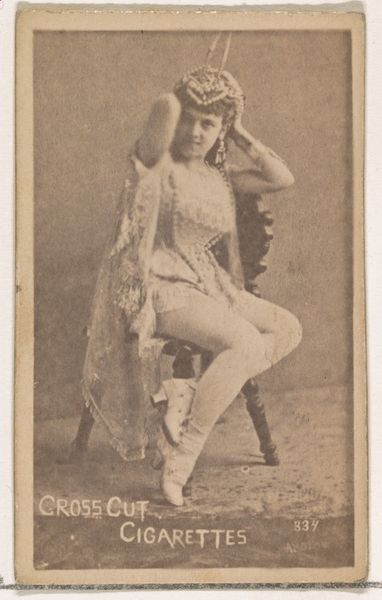 Editor: This is Jenny Lee, from the Actresses series, created in 1889 by Wm. S. Kimball & Co. It's a photograph, but it almost looks like a drawing or old engraving. It's small, like a trading card. What strikes me most is how overtly it was designed to be consumed, quite different from what we usually consider high art. How do you see this piece? Curator: Exactly. Let's focus on that "consumption." Kimball & Co. manufactured cigarettes, so we need to understand this image first as advertising, a promotional tool tied to the production and sale of tobacco. The process involved photography, printing, and distribution on a massive scale. Are we really to see this photograph, in its materiality, as being of any distinction to the other processes inherent to producing tobacco? Editor: So, you're saying that its primary function overrides any potential artistic intention? The portrait itself, the artistry... is secondary to the industrial process? Curator: Not secondary, integrated. Consider the subject: an actress, a figure already commodified, her image part of a performance for public consumption. The costume, the pose, even the printing technique – all carefully designed to entice the consumer, to elevate the Kimball brand and to draw attention in an economy rapidly driven by media consumption. Editor: I never really considered the implications of mass-produced art before. It recontextualizes it. Curator: Indeed, the image serves as a lens through which to examine the commodification of the entertainment industry and, on a wider scale, how industrial production reshaped notions of value, taste, and visibility. The mass circulation of printed images democratized representation, as well, yet simultaneously, solidified hierarchical relationships in an industrial and media-saturated age. Editor: That gives me a lot to consider about the process of creation and how a cultural image is developed within a network of consumption. Thanks!
