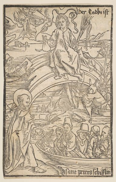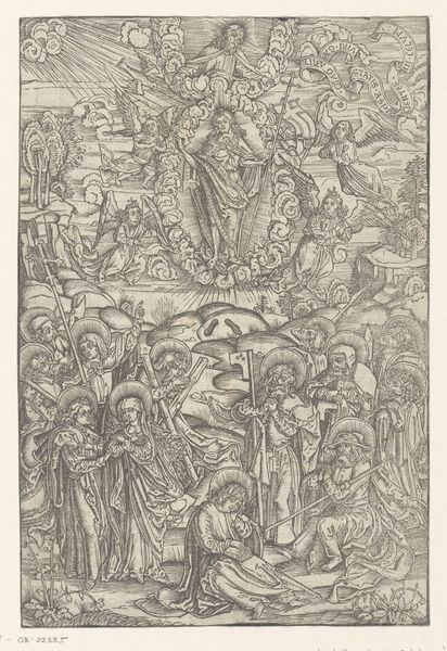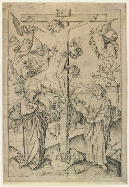Editor: Here we have Martin Schongauer's "The Crucifixion with Four Angels," an etching created sometime between 1470 and 1490. It's incredibly detailed for such a small print. I find the scene overwhelmingly sad, but strangely delicate. What's your take on this work? Curator: Delicate indeed, as is life, no? It’s a poignant, almost unsettling dance between suffering and grace. Look closely. Schongauer doesn't just present the crucifixion; he meditates on it. See how the angels hover, catching Christ's blood in chalices – grief becomes sacred act. How does this meticulous detail play out for you? Does it draw you in or create distance? Editor: I think it draws me in. It feels so…intimate, almost claustrophobic despite the landscape in the background. The expressions, even on the angels, feel very personal. Curator: Precisely! This isn’t just a historical painting; it's a deeply felt emotional experience rendered in precise lines. And notice the skulls at the base of the cross, constant reminders. Northern Renaissance artists had a knack for infusing spirituality with an intense awareness of mortality. It's heavy, sure, but like a good poem, it leaves you strangely nourished, wouldn’t you agree? Editor: Definitely nourished. I guess I hadn't considered how personal this print felt, almost like witnessing a very private moment. Thanks, that gives me a lot to think about. Curator: My pleasure! Art should be that little pebble in your shoe – keep thinking!