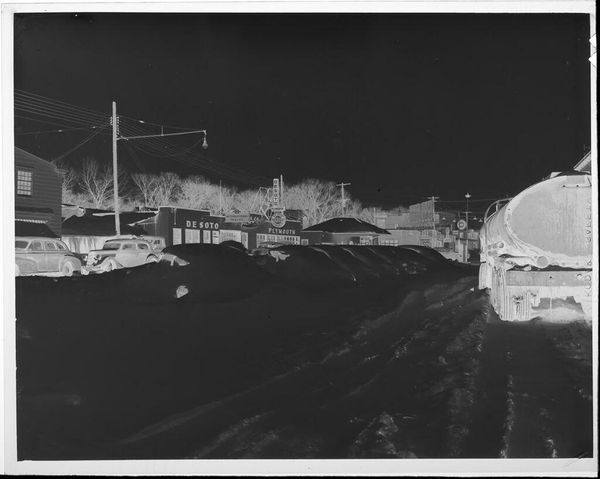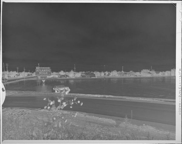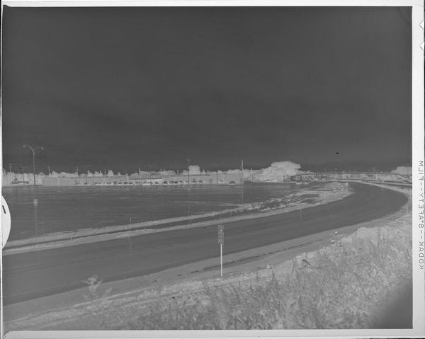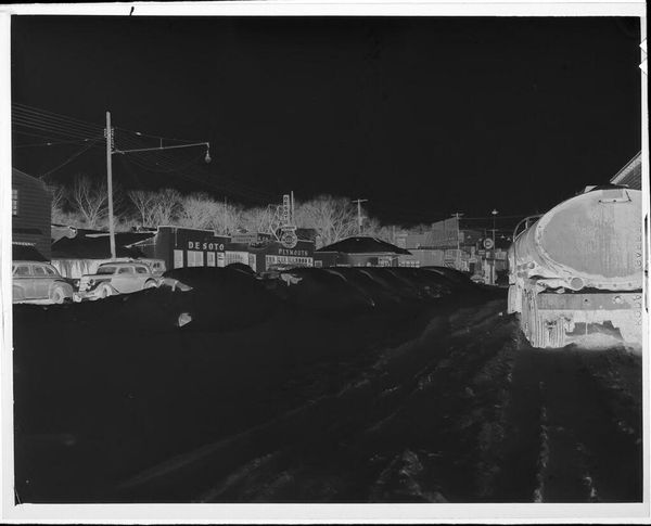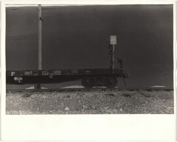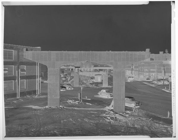 Editor: This untitled photograph by Jack Gould shows a man working on highway overpass construction. It's small, and the negative image makes it look almost apocalyptic. What do you see here? Curator: It speaks to the grand narratives of progress and infrastructure that dominated much of the 20th century. Who was this worker? The image normalizes the spectacle of infrastructure. It raises questions about labor, and the often-unseen hands that build our world. Editor: So, it's about the politics of building, not just the building itself? Curator: Exactly. How does this image contribute to or challenge the romanticizing of such large-scale interventions? Editor: I never thought about construction as something political, but this gives me a lot to consider.