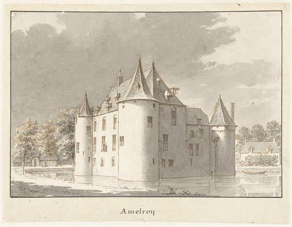 Curator: Here we have Hendrik Spilman's "Het kasteel te Zuilichem," a drawing made with pen and ink some time between 1733 and 1784. It’s currently held in the Rijksmuseum. Editor: It gives me such a distinct feeling, like peering through time. The grey wash and thin lines create an atmosphere of gentle melancholy. It's quite unassuming at first glance. Curator: I agree. And beyond the immediate aesthetic, it's also interesting to consider what the image of a castle represented in 18th-century Dutch society. It speaks of power, certainly, but also perhaps of an aspirational lifestyle, considering the rising merchant class. What stories were these images selling? Editor: That’s where I immediately think of the romanticized notion of rural life versus the reality for many. How was the castle, and by extension its inhabitants, positioned within the political and social hierarchy of the time? These idealized scenes served to mask certain power dynamics, didn’t they? Curator: Precisely! And what about access to the artwork itself? Was it meant for private enjoyment, or did it function within a more public sphere? Consider too how class dictated access to artistic creation as much as viewership, where art institutions tended to amplify the tastes of specific social echelons. Editor: Right, these are often curated and circulated based on power. The details in the sketch, the architecture of the castle and the almost regimented trees, invite reflection on ownership and exclusion—both social and physical. Spilman's rendering acts not only as a simple visual document, but as a mirror reflecting cultural values and anxieties. Curator: Indeed. His choice to depict the castle almost serenely belies the complex history and human stories contained within its walls and on that landscape. Editor: Reflecting on Spilman's ink drawing has underscored how seemingly simple landscape scenes are packed with layers of meaning if we ask the right questions. Curator: It reinforces my belief that art serves as both a historical record and a prompt for contemporary critique.