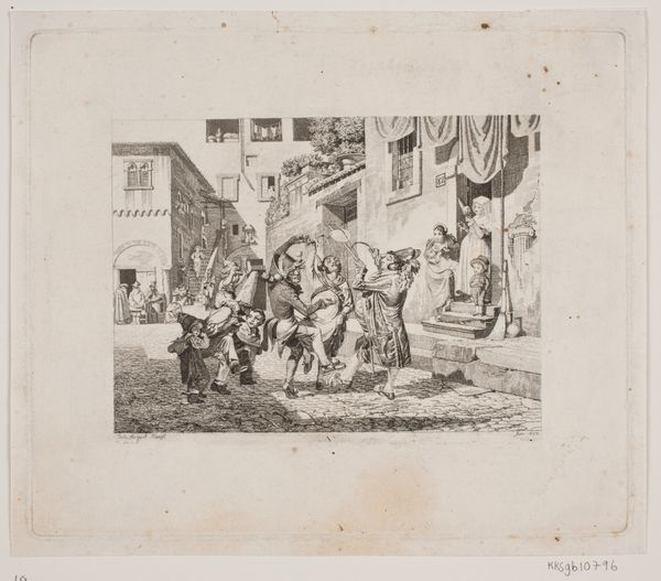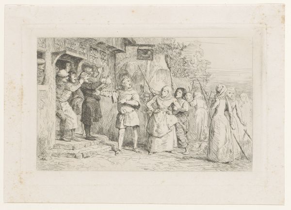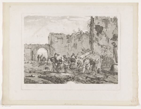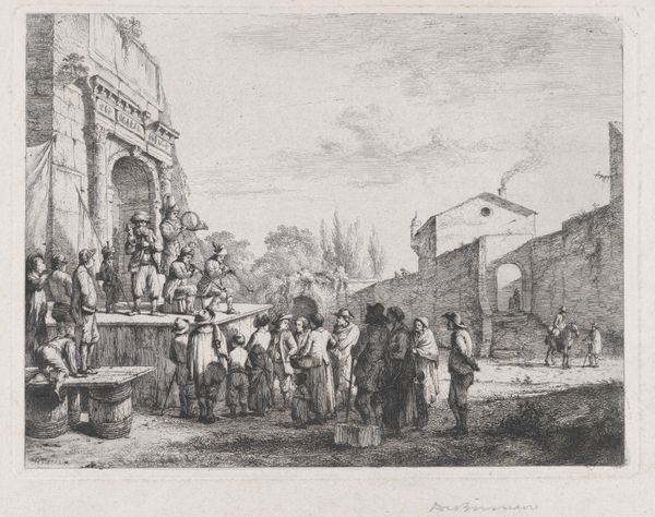 Editor: Here we have "Landscape with Charlatans on a Stage," an etching by Jean Jacques de Boissieu from 1772. I'm struck by how this everyday scene is elevated with what looks like classical ruins in the background; there's this real mix of high and low. How do you interpret this kind of juxtaposition? Curator: It's fascinating, isn’t it? Think about the socio-political landscape of the late 18th century. The artist positions these charlatans – these public performers, right? – against a backdrop of crumbling Roman architecture, hinting at the decline of empires and perhaps questioning the very foundations of authority. Consider how these performers entertained and potentially swindled the public. It suggests a commentary on the gullibility of the masses and the manipulative power of spectacle. Does this blend of landscape and social commentary offer any clues to you? Editor: Yes, it does! It makes me wonder if de Boissieu is also commenting on the role of the artist, maybe implying that art can also be a kind of performance, or even a deception? Curator: Exactly! And remember, Romanticism was emerging then, focusing on individual experience, but often tinged with social critique. Look at the audience's expressions, their clothes; they represent a specific class and the concerns of the time. It shows how the artist sees this population, versus, perhaps, the noble figures we saw in earlier art history? What does it tell us about de Boissieu and his biases, then? Editor: That’s really insightful. It shifts my focus from just the scene itself to the artist's own perspective and what he's trying to say about the society he lived in. Curator: Indeed. Art often serves as a mirror reflecting both the artist and their world. Understanding that relationship gives us a much richer understanding of a piece.
