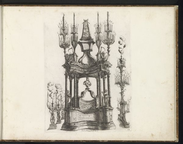 Filippo Passarini's "Ontwerp voor een altaar" is an undated sketch of an altar. We are invited into a space which has been carefully designed to inspire a sense of awe and reverence. The sketch offers insight into the Baroque aesthetic that dominated the art of its time, particularly its close ties to the Catholic Church. Altars like the one depicted were focal points for the community, reinforcing the Church's influence through visual grandeur. The etching not only demonstrates the highly ornamental style of the era but also raises questions about the social hierarchies embedded within religious spaces. Consider the labor and resources required to construct such elaborate structures, and who had access to these spaces. Think about the emotional impact on worshippers, and how art can shape and influence experiences of faith and devotion. The image serves as a reminder of the power of art to reflect, reinforce, and sometimes challenge the values of a society.