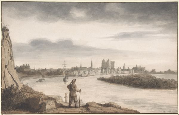 Editor: This watercolour by Frederick Nash presents Paris' Point Neuf and Pont des Arts. The tones feel muted, and the figures are really small against the architecture. What symbols or visual cues stand out to you? Curator: The bridges themselves are potent symbols. Bridges connect disparate points, signifying transition and exchange. Consider their cultural significance. The Pont Neuf, the 'new bridge', and the Pont des Arts, dedicated to the arts. The artist captures this connection, doesn't he? Editor: Yes! The bridge and the people on the bridge really emphasize the relationship between art and everyday life. Thank you! Curator: And thank you for connecting those dots! Seeing these bridges in this context truly illuminates their deeper symbolic significance.