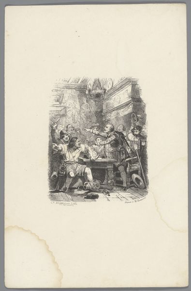 Curator: This drawing, "Man luisterend aan een deur," created by Gerhardus Fredericus Eilbracht around 1844-1854, welcomes us into a moment of clandestine eavesdropping. It's housed right here at the Rijksmuseum. The piece, done in pen, captures a very specific human interaction. Editor: Oh, immediately I get this air of suspense, right? Like, what's so juicy behind that door? The scene is just brimming with implied narratives. I love the way Eilbracht used those delicate lines to give everything this shadowy, almost dreamlike quality. It whispers of secrets and maybe some juicy gossip. Curator: Precisely. The piece blends elements of genre painting with a keen sense for narrative art. Consider how the act of listening in at the door isn’t merely a plot device but engages with themes of power dynamics, social exclusion, and the private sphere versus the public. What does it mean to intrude— or desire to intrude—on a space? Who holds access, and why? Editor: Oh, definitely, there's something deliciously naughty about it. He's practically pressed against the door! But what are those fellas inside up to, though? That cluster of men grouped around the table seems crucial. I’d almost call this the "original reality show". It almost hints that whatever is going on within, perhaps these people outside might also represent someone else in society looking in... maybe that's how we fit in, peeking into windows or doors like this character here. Curator: It certainly makes us reflect on who is granted entry into social life and on what terms. We, the viewer, join this figure in looking in at the margins; does it challenge conventional notions of inclusion and marginality as inherently liberatory or restrictive, or instead, something inherently hierarchical, predicated on these terms of entry? I see that as really powerful in its historical context. Editor: It also makes me think about the echoes across time—aren’t we all listening in to somewhere, always wanting to hear that voice beyond our wall? I will say the title’s description, even from years away, holds strong through many themes today and invites a great question of self. It just leaves me wondering what's so exciting inside. Curator: It prompts vital inquiries. Next time, I will ask our visitors to dwell a bit on our shared desire to sometimes eavesdrop into someone else’s affairs and reflect how it reflects contemporary anxieties surrounding gender, power, access, and historical exclusion. Editor: You know what? Next time, I will definitely bring my ear trumpet, because it just screams with unanswered, hushed tales. It invites its watchers in.