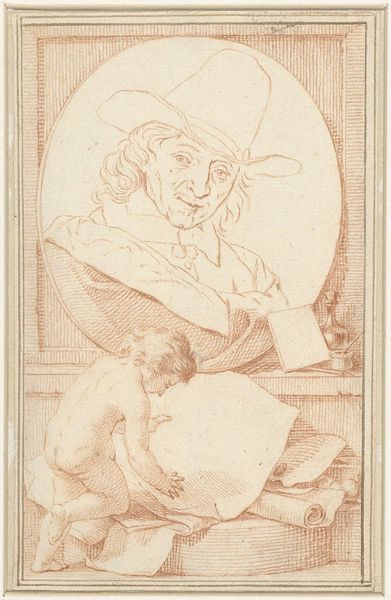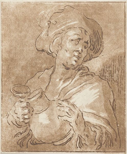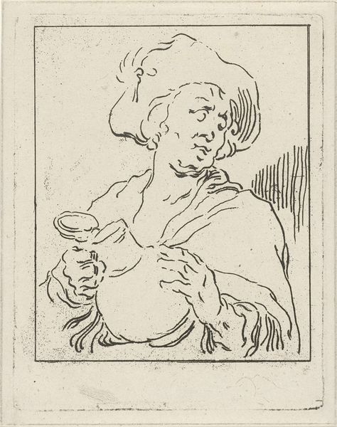 This is 'Man met kruik,' or 'Man with Jug,' an early 19th-century drawing by Hermanus Fock. Fock lived during a time of significant political and social upheaval in the Netherlands. This drawing invites us to consider representations of masculinity and labor. The man, possibly a worker or servant, is depicted with a jug, an object associated with sustenance and daily life. How does Fock portray the man's identity through his interaction with this object? The man’s gaze is cast downward which may reflect his social standing, but the loose clothing and hat lend him a sense of relaxed autonomy. This piece is emotionally resonant because it captures a quiet, personal moment. While it adheres to traditional artistic conventions, it also offers a glimpse into the lives of ordinary people. This image encourages us to reflect on the relationship between labor, identity, and the human experience.