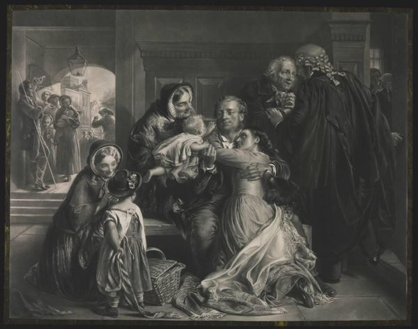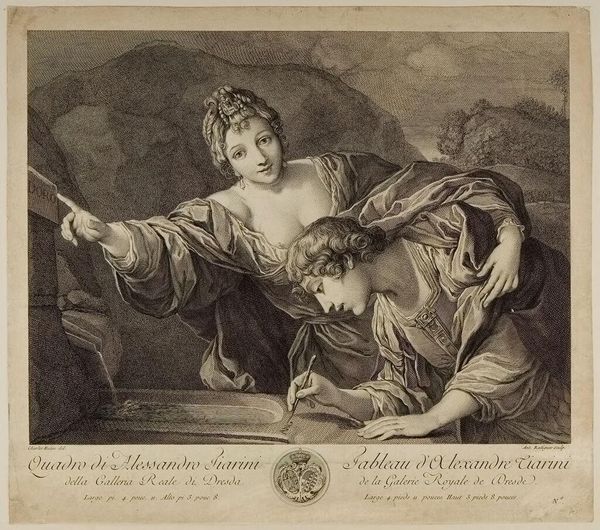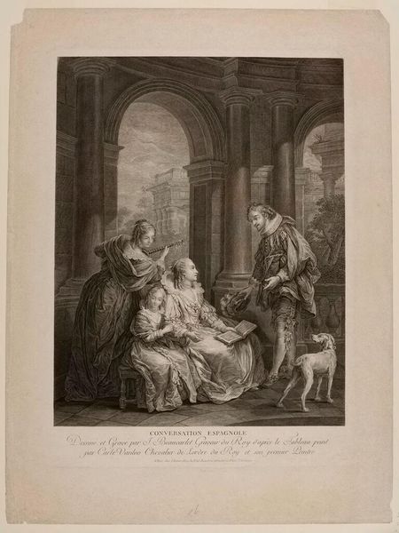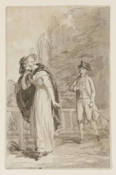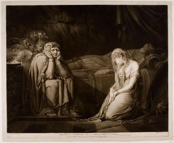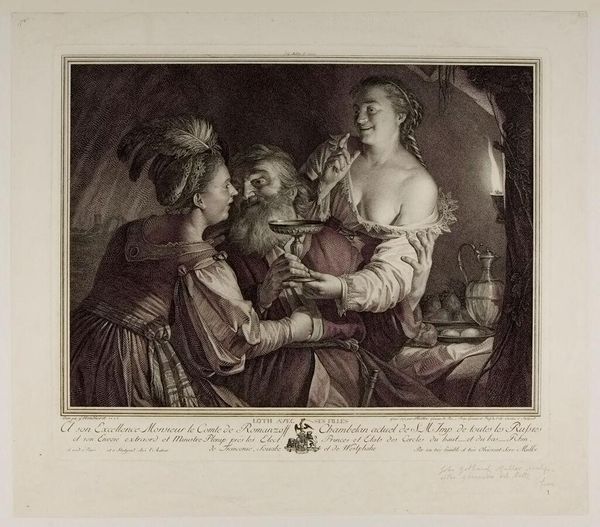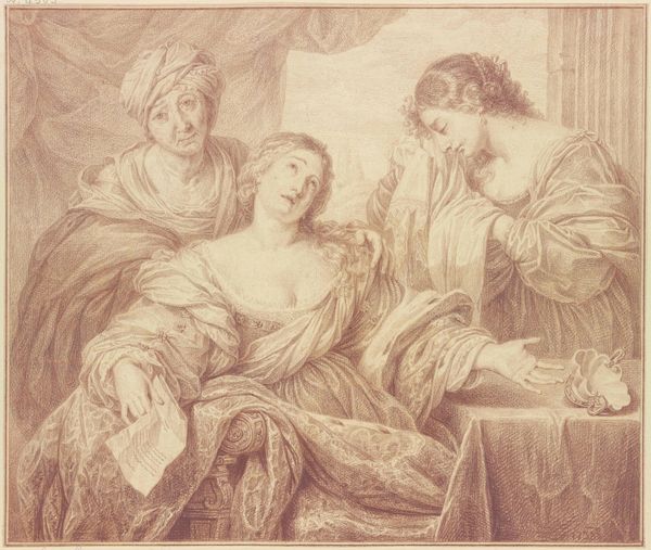 Editor: This is Joshua Reynolds’ "Garrick Between Tragedy and Comedy," from 1761. It's an oil painting, and the push and pull of the figures creates a real sense of drama, doesn't it? What strikes you most about it? Curator: What I see is a potent allegory of choice and influence. The piece is more than just a portrait; it's a commentary on the societal pressures faced by artists, specifically actors, during the 18th century. Garrick, a celebrated actor, is being pulled in two directions. We must consider the symbolic weight each female figure holds. Editor: Right, the two women vying for his attention! Could you expand on what they represent? Curator: Certainly! On one side, Comedy, in lighter colors, embodies pleasure and accessibility, a muse that promises immediate gratification but perhaps lacks intellectual depth. Tragedy, draped in darker hues, is a muse promising profound artistic and emotional experiences, albeit through suffering and perhaps less popular acclaim. Garrick's placement between them signifies the artist's dilemma: popularity versus artistic integrity, a tension that continues to resonate today. Consider, even, how gender is performed here. Editor: So, Reynolds isn’t just showing us an actor, but highlighting this conflict that many artists still struggle with. It’s fascinating to view it through that lens. I hadn’t thought about the gender dynamics at play either. Curator: Exactly. Reynolds compels us to reflect on the social structures that dictate artistic choices and the complex negotiations of identity for those in the public eye. And, critically, who benefits from those social structures? What impact does that have on what gets made and celebrated as "art?" Editor: Wow, this makes me consider how those power dynamics might influence my own work as an artist. Thanks, that's given me so much to think about. Curator: My pleasure. Keep asking those questions!