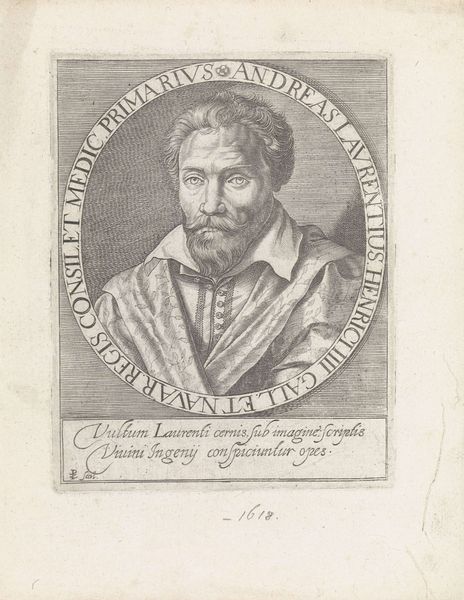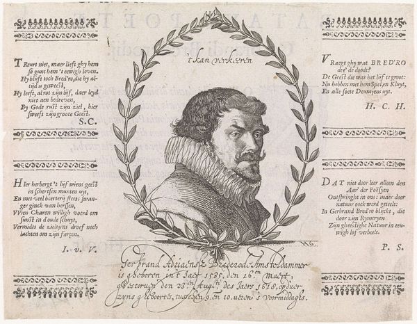 Curator: Take a look at this engraving, “Portret van Gerbrand Adriaensz. Bredero,” a print created sometime between 1618 and 1632, currently housed in the Rijksmuseum. It's by Hessel Gerritsz. What are your initial thoughts? Editor: Stark, very controlled. The intense gaze, combined with the tightly controlled lines of the engraving…it feels quite formal and rigid. I wonder about the subject, Gerbrand Bredero. Curator: Bredero was a playwright and poet during the Dutch Golden Age. Gerritsz's choice to depict him in this medium speaks volumes. The lines, hatched meticulously, construct form and convey texture economically. Note the details on the ruff collar—a symphony of short strokes creating dimension. Editor: The ruff practically screams social status. A deliberate symbol. Also, the print medium itself suggests wider accessibility—were these images intended to circulate Bredero's image and, by extension, his ideas? Was this political? Curator: Exactly! Consider the wreath. The controlled curvature surrounding Bredero adds to the geometric composition, emphasizing order and purpose. It hints at a calculated, almost propagandistic use of visual imagery to establish cultural legitimacy and ensure the recognition of Bredero’s accomplishments after his passing. Editor: That shifts my understanding. It’s not just a portrait; it’s a statement of enduring legacy. But also, this particular printing method suggests that we are now only able to see one of what may have been many iterations that circulated among a community of people with access to this person’s life and ideology. Curator: And don't miss the phrase " 't kan verkeeren" above his head. Its prominence reveals the image maker’s emphasis on Bredero’s own awareness of fate’s uncertainties, serving as a final and universal truth Bredero might express to any contemporary viewers. Editor: The interplay of formal composition and historical context offers insight not only into Bredero as an individual but also into the societal function of the arts in early modern Europe. Curator: Agreed. Studying Gerritsz's artistic strategy broadens our comprehension of this particular moment’s aesthetics. Editor: Absolutely; a potent combination of technique and historical placement can provide viewers with insight beyond what Bredero could ever give with a script alone.