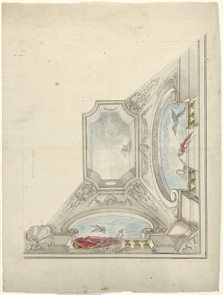 Dionys van Nijmegen created this design for a ceiling painting with pen in gray, brush in gray and watercolor. At first glance, the eye is drawn to the composition's complex geometry. An octagonal dome is delineated by lines that converge, creating a sense of depth. Note how the artist manipulates linear perspective to evoke a feeling of looking up into a grand architectural space. The soft watercolor washes create subtle gradations of light and shadow, enhancing the illusion of three-dimensionality. Within this framework, van Nijmegen employs ornamental details such as cherubic figures and rococo flourishes. These decorative elements add complexity but also serve a structural purpose. The cherubs placed near the corners mediate between the architectural framework and the ethereal sky painted within the dome's panels. Consider how the artist uses line and form to suggest a transition from the tangible world to an idealized, heavenly realm. This interplay between form and content invites ongoing interpretations, reflecting how art engages with our perceptions of space, beauty, and the sublime.
