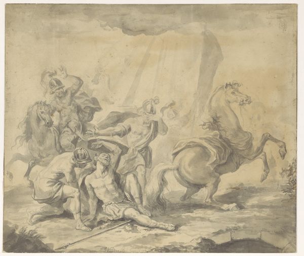 These three illustrations, made with pen and brown wash by Godfried Maes, depict scenes from Ovid's Metamorphoses, a text that has long resonated within Western art and literature. Maes, working in the late 17th century, taps into the mythological narratives that often served to reinforce societal structures and power dynamics. These drawings capture the story of Jupiter and Io, rife with themes of transformation, seduction, and power. Jupiter's pursuit of Io, and her subsequent transformation into a heifer to hide her from Juno's wrath, raises questions about female agency and the consequences of male desire and dominance. Maes presents this story through a lens that both celebrates classical narratives and hints at their inherent tensions. Consider how the tale reflects the delicate negotiation of identity and survival, a poignant commentary on the enduring narratives that continue to shape our understanding of gender, power, and the self.