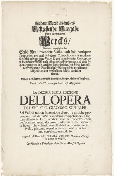 Curator: This piece presents an interesting window into early 18th-century garden design. This is “Johann Jacob Schüblers Neunzehende Ausgabe seines vorhabenden Wercks,” dating from after 1724. Editor: Woah, a real typographical feast! All those baroque fonts shouting at each other… What is it, exactly? Curator: It’s an engraing print poster. Jeremias Wolff published this nineteenth edition, depicting various garden ornaments—cascades, antique busts, and what sounds like rather elaborate landscaping. Editor: "Typographical feast" is too kind. It’s almost aggressive, isn’t it? It feels like visual noise designed to overwhelm. All those Teutonic letterforms are supposed to sell landscaping ideas? Curator: Remember the time, though. The Baroque *loved* ornament, loved density. And print was how you advertised then! Look at how the descriptions boast of novelty and refined taste—garden design was serious business for the wealthy. Editor: Yes, but who had time to decode all that verbiage? Perhaps its aesthetic impact outweighed its legibility. I think this points to a system where only a privileged elite, proficient in ancient languages and social etiquette, can actually decipher the piece. Curator: Well, certainly the leisure to cultivate such gardens presupposes significant wealth and privilege. Note how Latin phrases also weave into the German and Italian text here—a real display of erudition! It speaks to power, knowledge and international commerce Editor: I see those textual references you mentioned function like performative gatekeeping: Who's *in*, and who is manifestly *out*. How can we make these historical design manifestos feel relevant today? Curator: Well, thinking about the fight for public space in contemporary cities. The battle to shape our environment, the echoes of privilege and power... Perhaps these ornamental gardens offer a strange mirror to those struggles. Editor: A fascinating link. And the discussion helps me to feel far less overwhelmed by those Teutonic fonts—so thank you! Curator: My pleasure. Let's go find something more legible next!