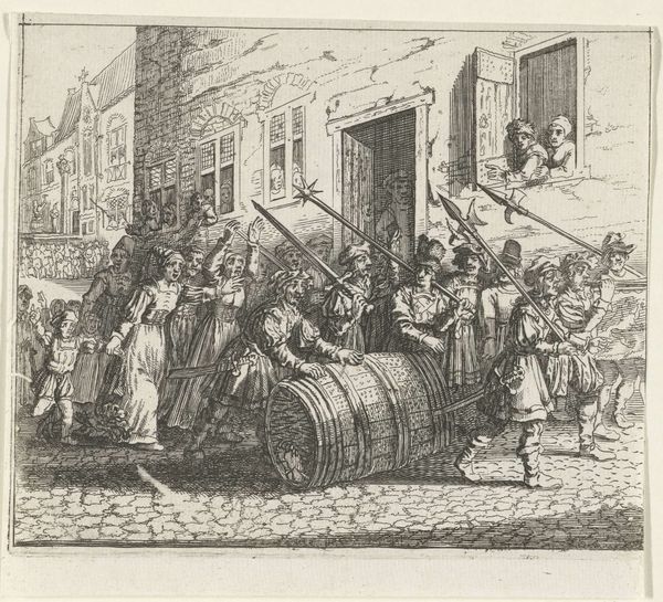 Editor: So, this etching, "Tandarts," from somewhere between 1528 and 1580 by Balthazar van den Bos, portrays a busy town scene. I'm struck by how it seems to capture both everyday life and a sense of unease, like something a little seedy is going on just below the surface. How do you interpret this work in terms of its cultural context? Curator: The unease you sense is palpable and probably quite intentional. Think about the role of the travelling dentist in this period. Often depicted as charlatans, preying on the vulnerable, their practice becomes a performance, a public spectacle that mirrors other forms of social exploitation. Van den Bos places the 'Tandarts' squarely within a bustling cityscape, normalizing a potentially shady activity amidst the regular hustle and bustle. Editor: Interesting! So, is the artist critiquing something specific about society at the time? Curator: Absolutely. The print acts as a commentary on the blurring lines between commerce and deceit, and the spectacle of early medicine. These scenes often served to highlight anxieties around trust and social order in a rapidly changing urban environment. Notice how the artist carefully positions various figures—the dentist, his patient, onlookers—each contributing to a larger narrative about societal anxieties. Where do you think Van den Bos wants us to place our gaze? Editor: Probably on the central interaction... or maybe all of it. I never would have considered how socially loaded this could be! I assumed it was just a regular depiction of life back then, like an amusing snapshot of medical procedures. Curator: And that's the brilliance of genre scenes like this! They appear simple but unpack complex cultural attitudes if you examine how artistic choices reinforce particular viewpoints and anxieties about the changing world. Editor: Wow. I’ll definitely see these "everyday" etchings differently now, thinking about the social commentaries that might be embedded within them.