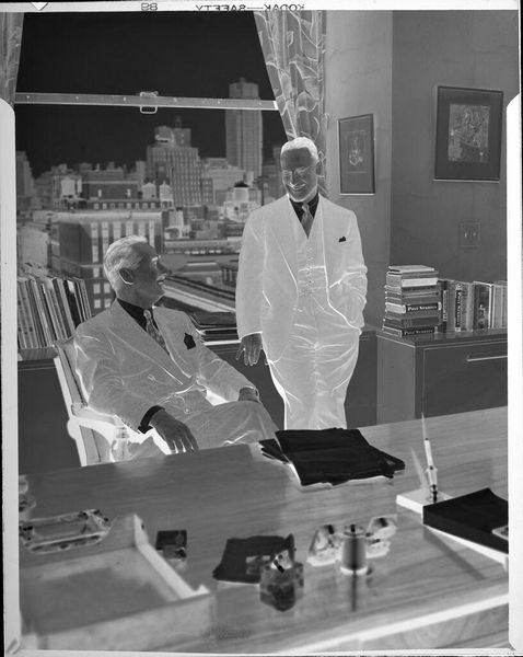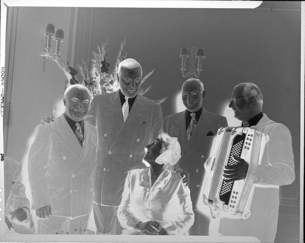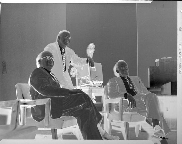 Editor: This photograph, "Untitled (three men with film projector)" by Peter James Studio, shows three men alongside a film projector. It feels like a moment frozen in time, a forgotten purpose. What visual symbols stand out to you here? Curator: The inverted image evokes memory and its unreliability. The projector, an instrument of storytelling, becomes almost ghostly. Notice how the men are posed, almost like figures in a history painting, suggesting the importance of their work, perhaps lost to time. What stories do you think they hoped to tell? Editor: That's fascinating! The idea of lost narratives really resonates. Thanks for pointing that out. Curator: Consider how the camera, as a visual tool, makes us think about its role in shaping the cultural memory, and who gets to participate.