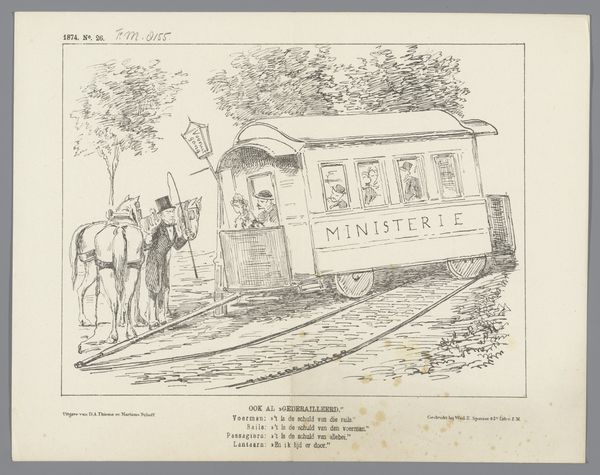 Editor: Here we have a lithograph from 1884 titled "Spotprent op de Transvaalse spoorweglening," which translates to "Cartoon on the Transvaal Railway Loan" by Johan Michaël Schmidt Crans. It's quite satirical, with these figures standing in front of a bizarre-looking train. How do you interpret this work? Curator: This image offers a fascinating lens through which to examine Dutch colonialism and its critique. It’s a caricature, clearly, commenting on the Transvaal Railway Loan. Look at the train itself; it's overloaded with "goodies" and symbolic items. What do you think those represent in the context of colonial exploitation? Editor: I see labels like "Bible," bottles, and flags. It feels like a critique of how religion and national pride were used to justify economic exploitation, with the "goodies" maybe representing the wealth being extracted. Is that close? Curator: Absolutely. And the "Framsyjaat" inscription, which sounds like 'Franse-chica' from a contemporary understanding, maybe references European involvement in and benefit from this endeavor. Consider, also, that critiques of colonialism often came from within the colonizing countries themselves, reflecting internal tensions and debates about national identity and morality. Does that perspective shift your understanding of the image's purpose? Editor: Definitely. It’s not just a simple condemnation, but a complex commentary reflecting internal struggles with colonial policies. I hadn’t considered that level of nuance. Curator: Exactly. Cartoons like these were powerful tools for shaping public opinion and challenging dominant narratives. It makes you wonder about the artist's own social and political position, and the audiences they hoped to reach with this piece. Editor: That's incredibly insightful. Thanks for helping me to see it with that framework!