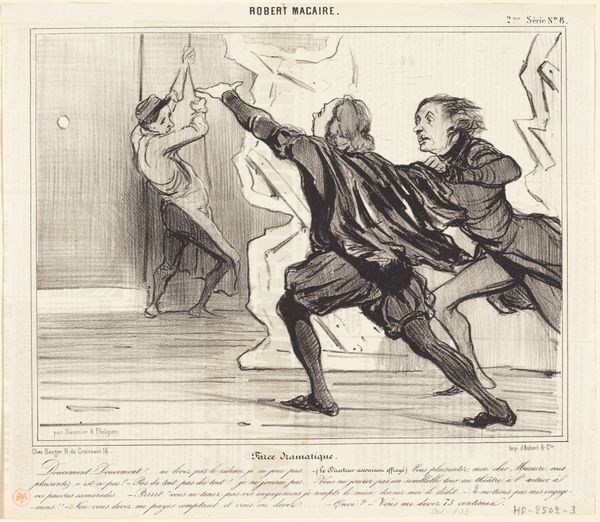 Curator: Looking at "Au Jardin des Plantes," an 1859 lithograph by Honoré Daumier, I'm struck by its theatrical drama, even just on first glance. It’s got this immediate feeling of absurdity, almost like a comedic opera frozen mid-scene. Editor: Exactly. The bars immediately force a grid-like composition, punctuated by these frantic gestures on one side and a very calm, towering figure on the other. The cross-hatching in the shadows deepens the contrast, emphasizing the performance element. Curator: And what a performance! You see Daumier doing what he does best, taking everyday life – a visit to the Jardin des Plantes, in this case – and skewering it with his satirical wit. He's like a fly on the wall with an inkwell. The man reacting looks almost like a caricature of royalty! Editor: Yes, the figure's outrage seems completely disproportional to the situation, which amplifies Daumier's commentary on the absurdity of societal ego. It feels quite staged, the dramatic reaction set against the very clear lines of the bars of the enclosure holding an actual, physical beast. Semiotically, you see that divide played out in multiple registers. Curator: True. He seems to be commenting on how pompous authority is continually mocked and humiliated by an ever chaotic modernity, symbolized, of course, by a cheeky elephant. What tickles me most is how current it all feels despite being over 150 years old. A quick-witted commentary rendered by the magic of lithography; such fluidity achieved with stone! Editor: It’s an important piece because it illustrates Daumier’s incisive social critique combined with his masterful handling of form. Curator: It’s Daumier being Daumier—eternally relevant, holding a mirror up to our follies and making us laugh at ourselves a little bit. Editor: An act of aesthetic reflection in a complex urban landscape.