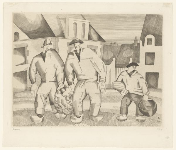 Curator: This is Norman Barr's "Fish Market," a graphite print created in 1939. It offers a glimpse into a slice of working-class life during the late Depression era. Editor: It’s immediately striking. The stark contrasts, the almost architectural lines… it evokes a sense of sturdy industry but also a kind of muted melancholy. There's a solemn feel to these men and their labor. Curator: Absolutely. Barr, in 1939, likely aimed to portray honest labor amidst widespread economic hardship. This print, being a multiple, could reach a broader audience, embedding working-class realities in the public consciousness. The print medium democratizes access. Editor: The figures certainly stand out as emblems of their roles, but they seem anonymous, too. Look at the man with the pipe – he exudes authority, but also a resignation. The smoke curling from his pipe hints at something beyond the immediate, perhaps anxieties related to sustenance. Is this about their actual labor, or the threat to their existence because of lack of work? Curator: I think both are undeniably intertwined. Fish markets often represent both abundance and vulnerability. Barr's emphasis on these stoic figures amidst tools and boxes resonates with realism while pointing to the precariousness of working life. These men selling the "catch of the day" reflects our shared understanding that something as reliable as food can be lost. Editor: The shadows accentuate that precarity. They are solid, imposing… almost looming, hinting at forces that impact these men. And I wonder about the upward crane. Its arms extending outward with its payload dangling is an echo of other cruciform images throughout the ages of humankind. The daily work is a ritual. Curator: Interesting reading. It may also signal an emerging industrial age intruding into traditional, agrarian practices. Either reading positions labor between established traditions and shifting societal realities. It encapsulates the era's tensions. Editor: In its simplicity and starkness, "Fish Market" feels particularly resonant today. We're always looking at images that tell stories of shared past. Curator: Indeed, Norman Barr provides a valuable depiction of a common yet challenging vocation. It is art with purpose beyond mere representation. Editor: I agree. The image leaves you reflecting on not only the workers and their toil but on the symbols, shared work, history, sustenance and memory.