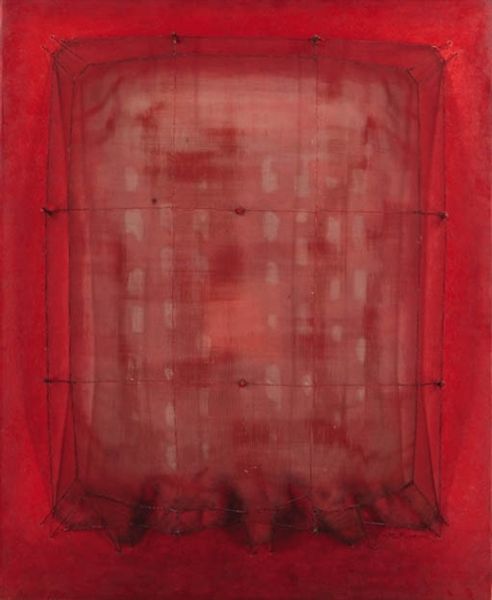 Editor: Soledad Sevilla’s untitled work, an ink drawing on paper, presents this fascinating juxtaposition of rigid geometric structure with free-flowing strokes. The overall effect is quite serene, yet the bold, wine-colored marks command attention. What do you see in this piece? Curator: I’m immediately struck by the tension between order and chaos, which resonates deeply within the human psyche. The grid, a symbol of control and rationality, is overlaid with these gestural, almost visceral, marks in ink. Don't you find this layering evocative? It's a powerful visual language that suggests the struggle to contain or define raw emotion. Editor: Yes, the layering definitely adds complexity. It reminds me of maps, almost, with a kind of coded landscape. Curator: Precisely! Maps are not just representations of physical space, they embody power, knowledge, and cultural perspective. The geometric foundation serves as the established order, while the bleeding ink might represent disruption, transformation, or the unavoidable erosion of these structures over time. Are these marks wounds, perhaps? Or are they birth pangs? Editor: That's a really interesting thought! Wounds or maybe, like, outbursts from suppressing something. I hadn’t thought about it in that light, it's quite powerful to think of these symbols speaking to our history. Curator: Visual symbols work best precisely when they become a mirror, don't you think? When you project what they can offer you onto their appearance? The enduring power of art is to evoke an individual reading! Editor: Absolutely. I am looking at this piece in a totally new light! Curator: Me too. These dialogues are how cultural memories are shaped, tested and revealed.